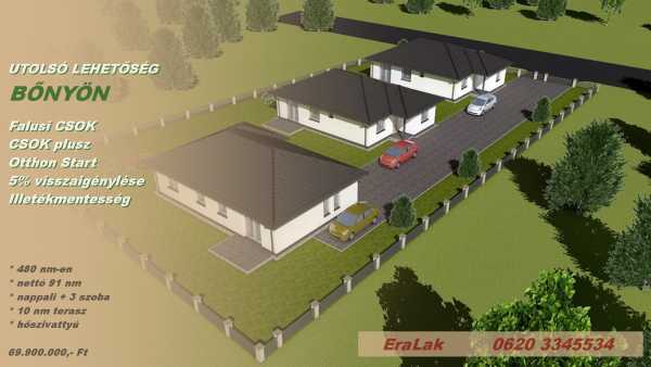 Választható Ajándék Önnek: 2 MILLIÓ FORINT ÉRTÉKBEN - lehet ez konyhabútor - burkolatok - kerítés - redőnyök ... A DÖNTÉS AZ ÖN KEZÉBEN VAN! Bőnyön amerikai konyhás nappalival+3hálószobával+saját kerttel ÚJ építésű családi ház eladó CSOKkal és FALUSI CSOKkal!! UTOLSÓ LEHETŐSÉG A PROJEKTBEN. Higgye el! Megéri az a pár kilométer. Győrtől és Komáromtól is pár percnyi autóútra...tökéletes családi otthonok, elérhető áron! A Győr-Moson-Sopron Vármegyei településen BŐNYÖN új építésű családi házak eladók. A település központjához közel, de csendes zsákutcában került megtervezésre ez a kis mini lakópark. A nagyméretű telken 3 családi ház került elhelyezésre. Mindegyikhez saját - körbekeríthető - 400-nm-es telekkel rendelkezik. UTOLSÓ LEHETŐSÉG!! A 2. számú épület 90,73 nm - amerikai konyhás nappali+3hálószoba+terasszal épül. Az ár emeltszintű fűtéskész árat takar, telekhányaddal. A fizetés készültségi foknak megfelelően történik. Kulcsrakész átadás külön megállapodás alapján lehetséges. Jelenleg az alapozás és lábazat már elkészült. További munkálatok az elkötelezettség után történik. Átadás kb. 10 hónap. FALUSI CSOK - CSOK plussz - 5 %-os ÁFA visszaigénylése - otthonteremtési támogatások igénybevehetők. Műszaki: 30cm NF Leier TÉGLA falazat, 12 cm grafitos homlokzati hőszigetelés, 10 cm válaszfal tégla. Könnyűszerkezetes födém, 35 cm szálas szigetelés. Fehér hőszigetelt homlokzati nyílászárók, 3 rétegű üvegezéssel. Antracit beton tetőfedés, színezett ereszcsatornával. Fűtése hőszívattyúval, padlófűtéssel történik. "H" tarifás áramellátás. Hívjon. Beszéljünk róla. Nézzük meg együtt. Akár hétvégén is. Irodánkban bankfüggetlen hitel tanácsadással és ügyintézéssel segítjük álmai megvalósításában. CSOK és állami támogatások intézése. Jogi és energetikai háttér.