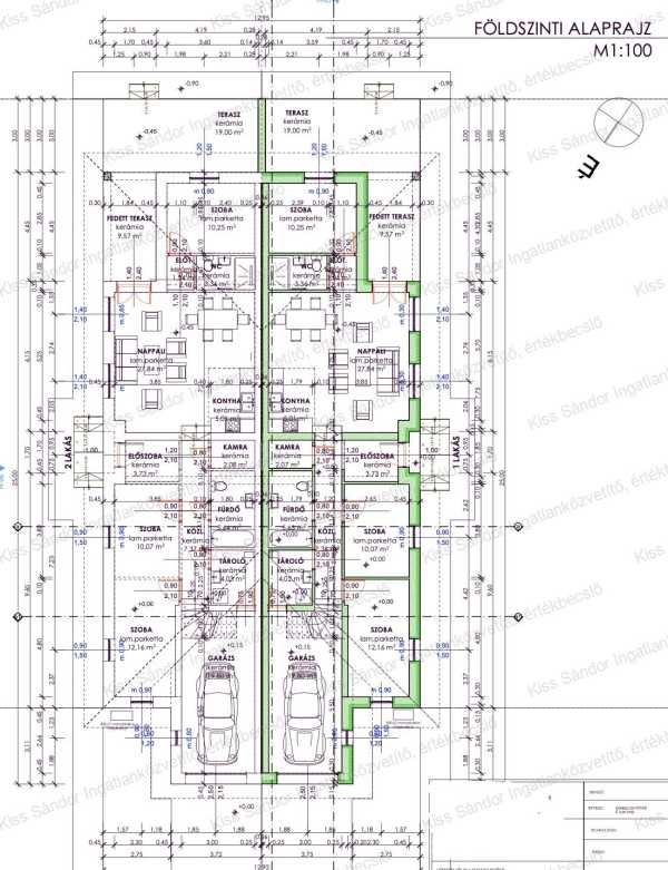 Ikerházi lakások eladók Hajdúsámson Martinka csendes lakott környezetben 2026 évvégi költözéssel Alapadatok: - Teljes ingatlan területe: 2.105 m2 - Telekhányad: 1/2-1/2, a telek a vételár részét képezi! - Lakótér nettó alapterülete: 127,6 m2/lakás - Garázs alapterület: az összesített nettó részben szerepel, 19,8 m2/lakás - Fedett terasz: + 9,57 m2/lakás - Nyitott terasz: +19,1 m2/lakás Helyiségek: - Földszint: - Konyha - Étkező - Nappali - 3 db hálószoba - Kamra - Fürdőszoba WC-vel - WC mosdókagylóval - Háztartási helyiség - Közlekedő - Előtér - Garázs - Tetőtér - Szoba - Külső teherhordó falak: 30 cm Leier NF tégla - Belső teherhordó fal( garázs és hálószoba között): 25 cm Leier NF tégla - Lakóegységek közötti fal: 2x25 cm Leier NF tégla, közte 5 cm hang gátló kőzetgyapot réteggel - Válaszfalak: 10 cm Leier válaszfal tégla - Födém: fa födém kialakítás - Garázs feletti födém: fa gerendás, OSB-lap borítással - Nyílásáthidalók: kisebb fesztávnál Leier áthidaló, nagyobb fesztávnál vasbeton gerenda - Rejtett redőnytok nem kerül kialakításra - Belső lépcső: vasbeton lépcső acélcső korláttal Tetőszerkezet: - Tetőfedés: Leier hullámos betoncserép, antracit színben - Ereszkialakítás: csüngő eresz, lambéria borítás festés nélkül - Bádogos szerkezetek: színezett aluminium antracit színben - Lakásokat elválasztó szerkezet: tűz gátló gipszkarton és 20 cm Therwollin szigetelés Hő- és Vízszigetelés: - Homlokzati szigetelés: 15 cm Thermodam EPS - Lábazati szigetelés: 10 cm Thermodam XPS - Padlószigetelés: Talajnedvesség elleni szigetelés, 12 cm Thermodam lépésálló EPS - Födémszigetelés: 30 cm üveggyapot Színezés: - Homlokzati színezés: Ceresit CT60 tört fehér - Lábazat: antracit színű gyöngykavics műgyanta bevonattal - Belső festés: - Glettelés 2 rétegben - Fehér szín felhordása 2 rétegben Belső építészet, nyílászárók: - Mennyezet: gipszkarton egy rétegben, vízszintes elrendezés - Nyílászárók: Veka műanyag, 3 rétegű üvegezés, kívül-belül fehér - Külső párkány: lemez - Belső könyöklő: műanyag, fehér színű - Beltéri ajtók: 10db dekorfóliás teli ajtó, papírrács betéttel, utólag szerelhető tokkal, zárral, kilinccsel Burkolatok: - Hidegburkolat: választható - Helyiségek: előszoba, konyha, étkező, fürdő, wc, kamra, garázs, terasz, bejárati lépcső - Fürdő és WC oldalfal hidegburkolat: 2 m magasságig, - A konyha és kamra oldalfal burkolata nem része a tartalomnak. - Melegburkolat: laminált parketta a nappaliban, 4 db hálószobában és a közlekedőben. Gépészet: - Kondenzációs kombi gázkazán kéménnyel - 4 db radiátor: szobánként 1 db, - 1 db törölközőszárító radiátor a fürdőszobában - 2 db termosztát - Konyha-étkező-nappali padlófűtés - Szaniterek: - 1 db Alföldi mosdó (fürdőszoba) - 2 db Alföldi mosdókagyló (garázs,WC) - 1 db akril kád - 2 db Alföldi WC csésze, tartállyal és ülőkével - Csaptelepek: - 3 db Mofém Mambo mosdó csaptelep - 1 db Mofém Mambo kádtöltő csaptelep - Kiállások: mosdó, mosógép, mosogatógép kialakítása - Ivóvíz és gázvezeték kiépítése, engedélyeztetése, mérőórákkal ellátása - Szennyvízvezeték kiépítése Elektromos szerelés: - 1 fázis, 32A elektromos mérőóra az utcai kerítés vonalán - Legrand aljzatok fehér színben, helyiségenként 1 db kapcsoló, 3db dugalj: termékenként - 5 db TV kiállás - 4 db fali kar kiépítése a külső homlokzatra - Riasztó előkészítése Külső munkák: - Térkövezés-: 10x20 cm szürke térkővel - Utcai kerítéstől a bejáratig 1 m szélesség - Köztes kerítés építése: - Bejárattól teraszig 1 m szélesség - Oldalt és hátul 40 cm szélesség - Garázs bejáratnál 3 m szélesség - 2 sor zsalukő, függőleges zárt szelvény, drótháló borítás