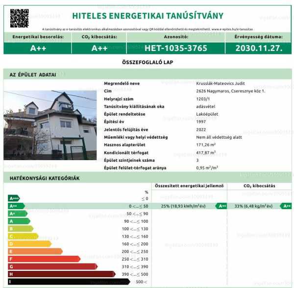 ÖRÖKPANORÁMÁS, A++ energia-osztályú családi ház a Dunakanyarban! Nagy családnak vagy több generációnak, de akár nagy létszámú vendégháznak is alkalmas családi ház eladó Nagymaros "Rózsadombján", a Szálloda utcában. Ennek a háznak a különlegessége, hogy bármelyik ablakon néz ki az ember, csodás panoráma tárul elé: egyik oldalon a Visegrádi hegység vonulatait, a Fellegvárat és a Dunát látja, másik oldalon a Börzsöny erdejében vagy éppen a kertben és távolabb a hegyekben gyönyörködhet. Az ingatlan Lke-B1 besorolású lakóövezetben található, tulajdonilapon lakóházként van feltüntetve. fix 3%-os hitel és CSOK felvehető rá! Három szinten összesen 140 négyzetméter a hasznos lakótér, amelyben 5 és fél szoba, két konyha, 3 fürdőszoba és egy külön wc található. A garázs (20 nm), a teraszok (2x12 nm) és az erkély (1,5 nm) területe nincs beleszámolva! Az alsó szinten egy szoba-konyha-zuhanyzós fürdőszoba egységből álló lakótér, valamint a garázs és a mosókonyha található. A belső lépcsőházból megközelíthető a körpanorámás középső szint. Itt található egy kádas fürdőszoba, egy külön wc, valamint az amerikai konyhás, étkezős nappali, és az abból nyíló hálószoba. A nappaliban meghitt hangulatot áraszt egy hófehérre festett tégla kandalló. Az étkezőből és a nappaliból is ki lehet jutni a fedett teraszra. A lépcsőházban még egy szinttel feljebb a tetőtérbe jutunk. Itt egy nappaliból, két hálószobából és egy zuhanyzós fürdőből álló lakótér található, pazar panorámával, kicsi erkéllyel. Az alsó és a középső szint teraszáról egyaránt ki lehet sétálni a gondozott kertbe, ami díszfüvekkel, díszfákkal van beültetve, valamint a kert végében egy családi-baráti bográcsozásra, szalonnasütésre alkalmas tűzrakó hely is található. A ház előtt az utcafronton 4 autó számára elegendő szórt köves privát parkoló szolgálja az itt lakók kényelmét. A ház 1998-ban épült B38 Porotherm téglából. Jelenlegi tulajdonosai több ütemben felújították, modernizálták, így érte el jelenlegi, A++ energiabesorolású állapotát: -A tetőteret 2019-ben 15 cm-es Rockwool kőzetgyapot szigeteléssel és dupla tűzgátló gipszkartonnal látták el. -2020-ban az eredeti 5 cm-es EPS szigetelésre még 10 cm grafitos szigetelés került, és ekkor kapta a ház a jelenlegi külső színezett nemesvakolatot is. -2022-ben újra zsindelyezték a tetőt, amelyre 8.1 kWp teljesítményű napelemrendszer került kiépítésre (szaldós elszámolással). A középső szinten és a tetőtérben Fischer Nordic fűtésre optimalizált klíma biztosítja a kellemes hőérzetet télen-nyáron, az alsó szintet pedig 2 db Nobo fűtőpanel látja el. A fürdőkben törölköző szárító radiátor található, a melegvizet pedig egy 120 literes Ariston bojler biztosítja. A középső szinten padlófűtés is ki van építve, ehhez a csatlakozók a mosókonyhában találhatók. Bármikor visszaköthető a rendszerre egy kondenzációs cirkó, a két kéményből az egyiket ehhez megfelelően újra bélelték (a másikba van bekötve a kandalló). Közművek közül vezetékes víz, 3x16A áram és gáz a házban, csatorna az utcában található (jelenleg emésztőbe távozik a szennyvíz). Az ár FIX, tartalmazza a gépesített IKEA konyhát, a nappali teljes bútorzatát valamint az egyik hálószobában egy 200x60x260 cm-es tolóajtós IKEA gardróbszekrényt! Mivel van családon belül ingatlanos, így ingatlanosok segítségét, érdeklődését köszönjük, de nem kérjük!
