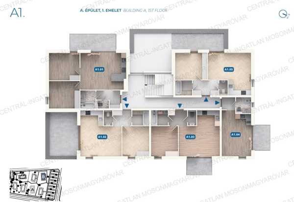 Hőszivattyús fűtés és meleg víz ellátás + hűtés rendszer!!! Új fejlesztésű, innovatív lakópark a Centrál-Ingatlan kínálatában. A város intenzíven fejlődő területén, családi házas környezetben újonnan épülő Duna Villaparkban lakások eladók. A kialakítás illeszkedik a környezethez. 12-13 lakásos épületek készülnek, így könnyen alakulnak ki a jó lakóközösségek. Az épület hőszivattyús fűtés-hűtés és meleg víz rendszerrel épül! Kiváló energetikai besorolással! A új építésű lakás jellemzői: - Az A1.05-es számú első emeleti lakás hasznos alapterület 52.3m2. A lakás határoló falain belüli terület 46.16m2, + erkély 12.28m2 (hasznos alapterület: határoló falakon belüli terület + erkély 1/2-e). - A lakás helyiségei: nappali, amerikai-konyha, 1 hálószoba, fürdőszoba, wc, közlekedő/előszoba helyiségek, és egy, nagy méretű erkély. • - A tervezésénél kiemelt figyelmet fordítottak az otthonok élhetőségére, a új lakások fekvésére, az ablakok nagy méretűek, így minden lakás világos, napos. A lakótömbökben kevés lakás készül, jó adottságokkal. • - Parkosított, füvesített környezettel kerül átadásra a lakópark. • - Az autóparkolók tudatosan a lakásoktól pár lépésre kerülnek kialakításra, ezzel is növelve a lakások csendességét. • - A több épülettömbből álló lakóparkba 2 emeletes (3 szintes) épületek készülnek. Igazodva a családi házas környezethez és növelve az ingatlanok későbbi értékét. Az épülettervezés modern, innovatív és a környezetbe illeszkedő. • - Minden lakáshoz erkély vagy terasz tartozik, a legfelső szinten lévő lakások panorámás, nagy teraszok készülnek. A földszinti lakásokhoz saját használatú kert tartozik. A kerthasználat árát a feltüntetett irányár tartalmazza. A saját kertek egységesen 30m2 területűek. • - A lakóparkból a belváros könnyen megközelíthető. 5-6 percen belül minden fontos kereskedelmi egység elérhető. Üzletek, iskola, óvoda, orvosi rendelő, posta, éttermek, buszmegálló, stb. A lakóparktól 15 perc gyaloglással elérhető a Mosoni-Duna ahol egy gyönyörűen kialakított sétány, strand és játszótér található. Pár perc alatt már a természetben lehet barangolni, ami kiváló hely egy délutáni sétára. • - A társasházat profi társasházkezelő cég üzemelteti gondoskodva a takarításról, fűnyírásról, karbantartásról. A földszinti lakások kertrészét is a kertészek tartják karban. -A lakások átadása emeltszintű, fűtés-készen történik, hogy mindenki a saját ízlése szerint tudja kialakítani a belső felületeket. -Igény esetén természetesen van lehetőség a kulcsrakész befejezést is kérni a beruházótól. -A homlokzat 15cm-es hőszigetelő rendszerrel burkolt, felületén szilikonos vakolattal, a tetőteraszok hegesztett műanyag, víz szigeteléssel lesznek ellátva. A szerkezet monolit vasbeton pillérvázas szerkezetű, 30-as Porotherm rendszerű kitöltő falazattal. -FONTOS a lakások között és a lakások lépcsőház felőli falainál speciális hanggátló fal készül + az aljzatokba 5-7 cm-es lépés-hangszigetelő akusztikai réteg készül a jó hangszigetelés érdekében. -Az ablakok, erkélyajtók 3 rétegű üvegezéssel, széles profillal szerelt nyílászárók. Minden ablak és erkélyajtó beépített tokos redőny előkészítést kap, ez tartalmazza a redőnytokot és a lefutó síneket. -Fűtés-hűtés, meleg-víz ellátás modern, nagy teljesítményű, levegő-vizes hőszivattyú fűtő-hűtő rendszer biztosítja épületenként, lakásonként egyedi méréssel és teljes szabályozhatósággal. A padlófűtés rendszer minden igényt kielégít, minden lakás padlófűtéssel szerelt. -A lakásokban hűtésre is van lehetőség, úgynevezett fan-coil beltéri egységgel. A hűtést a hőszivattyú végzi, minden lakásban elkészül a rendszer előkészítése. A beltéri egység felszerelése már a tulajdonosok feladata. -Minden átadott lakásokhoz 3 év teljes körű garancia jár, bizonyos szerkezetekre 8-15 év garancia. A - DUNA VILLAPARK építési ütemei folyamatosan készülnek, aktuális átadási időről kérjük érdeklődjön a megadott elérhetőségeken, az IV. ütem átadása 2027. III. negyedévben várható. A feltüntetett ár a parkolók árát nem tartalmazza. Most lakások teljes közműfejlesztés költségmentes, ami lakásonként több százezer forint megtakarítást jelent. Illetékmentes a lakásvásárlás. Ezt érdemes kihasználni. Akár egy konyhabútor árát is meg lehet spórolni. Amennyiben az új építésű lakások valamelyike , vagy bármely a kínálatunkban található lakás felkeltette érdeklődését, hívjon a megadott telefonszámon. Kollégám díjmentes, bank semleges hitel-ügyintézéssel áll rendelkezésére.
