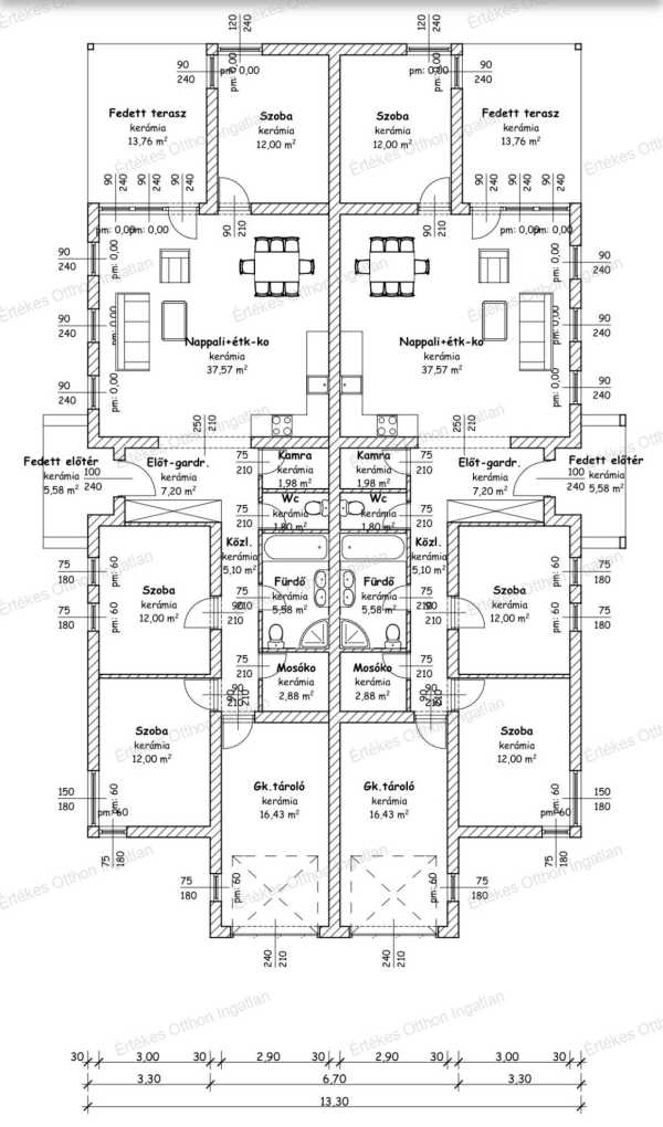 Nyíregyháza - Orosi úton, csendes, kertvárosi, gyermekbarát környezetben, Új építésű ikerház eladó! Főbb jellemzők: • alapterület: 117,45 m2, + 16,43 m2 garázs, • telek területe: 517,5 m2, • tégla falazat, • dupla hangszigetelés, • 15 cm szigetelés, • földszintes, • kelet – nyugat fekvésű, • alapja: vasbeton sávalap, • fűtése: hőszivattyús rendszer, padlófűtéssel, • födém: előregyártott vasbeton gerendák, beton béléstestekkel épülnek, • áthidalók: előregyártott, illetve monolit vb. áthidalások, • nyílászárók: műanyag szerkezetű 3 rétegű, 5 légkamrás, • fa tetőszerkezet, bramac cseréppel fedve, • a helyiségek padlóburkolata kerámia, illetve laminált parketta, • a válaszfalak 10 cm-es válaszfallapból, • járda az épület körül, illetve a gépkocsi beálló tér kövezve, valamint a terület körbekerítése az árban benne van. Élettér: 3 szoba, nappali-konyha-étkező, előtér-gardrób, kamra, mosókonyha, közlekedő, Fürdőszoba, WC, fedett előtér, fedett terasz, garázs. A felhasznált anyagok a mai korszerű minőségi és esztétikai elvárásoknak megfelelve kerülnek beépítésre, választható járólap és padló burkolat. Lakáscsere beszámítására van lehetőség értékegyeztetéssel! Csok Plusz, Babaváró hitel, Jelzáloghitelek a bankfiókokban elérhető legkedvezőbb feltételekkel, egyedi konstrukciókkal igényelhetők! Teljes körű, gyors, hatékony díjmentes hitelügyintézés. Ha szeretne egy különleges helyen élni, hívjon...