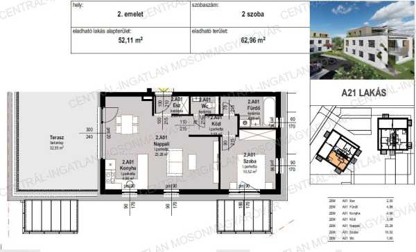 Hőszivattyús fűtés és meleg víz ellátás + hűtés rendszer!!! Új fejlesztésű, innovatív lakópark a Centrál-Ingatlan kínálatában. Jánossomorja új városfejlesztési területén kialakuló modern, 21. századi kisvárosias környezetben újonnan épülő lakóparkban lakások eladók. A társasházak illeszkednek a környező épületekhez, kisebb 9 lakásos épületek készülnek, így könnyen alakulnak ki a jó lakóközösségek. Az épületek hőszivattyús fűtés-hűtés és meleg víz rendszerrel épül! „BB” energetikai besorolással! A lakásokra igénybe vehető a kedvezményes CSOK Hitel! Energetikai besorolása bőséggel megfelel a követelményeknek. A új építésű lakás jellemzői: - A B22-es számú 2. emeleti lakás hasznos alapterület 62.5 m2. A lakás határoló falain belüli összterület 52.11 m2, + a hatalmas, panorámás terasz 31.16 m2. - A lakás helyiségei: nappali-konyha, 1 db hálószoba, fürdőszoba, önálló wc, előszoba helyiségek és panorámás terasz. - A tervezésénél kiemelt figyelmet fordítottak az otthonok élhetőségére, a új lakások fekvésére, az ablakok nagy méretűek, így minden lakás világos, napos. Az épületekben kevés lakás készül, jó adottságokkal. - Parkosított, füvesített környezettel kerül átadásra a lakópark. - Az autóparkolók tudatosan a lakásoktól pár lépésre kerülnek kialakításra, ezzel is növelve a lakások körüli zöldterületet. - Az első ütemben két épülettömbből álló lakóparkba 2 emeletes (3 szintes) épületek készülnek. Igazodva a családi házas környezethez és növelve az ingatlanok későbbi értékét. Az épülettervezés modern, innovatív, és a környezetbe illeszkedő. - Minden lakáshoz erkély vagy terasz tartozik, a legfelső szinten lévő lakások panorámás, hatalmas teraszok készülnek. A felső szinti lakások terasza 31-32m2 méretű, pl. műfűvel borítva egy igényes, wellness terasz is kialakítható. - A lakásokhoz saját tároló vásárolható, amely az épületek földszintjén van kialakítva. - A lakóparkból a város központja könnyen megközelíthető. 5 percen belül minden fontos kereskedelmi egység elérhető. Üzletek, iskola, óvoda, orvosi rendelő, posta, éttermek, buszmegálló. - A társasházat profi társasházkezelő cég üzemelteti gondoskodva a takarításról, fűnyírásról, karbantartásról. - A lakások átadása emeltszintű, fűtés-készen történik, hogy mindenki a saját ízlése szerint tudja kialakítani a belső felületeket. Igény esetén természetesen van lehetőség a kulcsrakész befejezésre is. - A homlokzat 15cm vastag hőszigetelő rendszerrel burkolt, felületén szilikonos vakolattal, a tetőteraszok hegesztett műanyag szigeteléssel lesznek ellátva. A szerkezet monolit vasbeton pillérvázas szerkezetű, 30-as Porotherm rendszerű kitöltő falazattal. FONTOS a lakások között és a lakások lépcsőház felőli falainál speciális, hanggátló fal készül + az aljzatokba 5-7 cm-es lépés-hangszigetelő akusztikai réteg készül a jó hangszigetelés érdekében. - Az ablakok, erkélyajtók 3 rétegű üvegezéssel, széles profillal szerelt nyílászárók, redőny előkészítéssel. - A lakás bejárati ajtók MABISZ minősítésű, 37 dB-ig hanggátló szigeteléssel ellátott. Minden ablak és erkélyajtó beépített tokos redőny előkészítést kap, ez tartalmazza a redőnytokot és a lefutó síneket. - Fűtés-hűtés, meleg-víz ellátás modern, nagy teljesítményű, levegő-vizes hőszivattyú fűtő-hűtő rendszer biztosítja épületenként, lakásonként egyedi méréssel és teljes szabályozhatósággal. A padlófűtés rendszer minden igényt kielégít, minden lakás padlófűtéssel szerelt. - A lakásokban hűtésre is van lehetőség, úgynevezett fan-coil beltéri egységgel. A hűtést a hőszivattyú végzi, minden lakásban elkészül a rendszer előkészítése. A beltéri egység felszerelése már a tulajdonosok feladata. - Minden átadott lakásokhoz 3 év teljes körű garancia jár, bizonyos szerkezetekre 8-15 év garancia. Az átadás 2027. I. negyedév. A feltüntetett ár a parkolók árát nem tartalmazza. A nálunk vásárlóknak a lakások befejezéséhez, bútorozásához egyedi kedvezményeket biztosítunk kiemelt partnereinknél! A beruházó most átvállalja a lakások teljes közműfejlesztési díját ami lakásonként több százezer forint megtakarítást jelent. + Redőny előkészítés. + Wc helyiségben rejtett tartályos öblítőrendszer beépítése. Amennyiben a jánossomorjai, új építésű Origó Házak lakópark, vagy bármely a kínálatunkban található lakás felkeltette érdeklődését, hívjon a megadott telefonszámon. Vásárolna, de nincs rá keret? Kollégám díjmentes, bank semleges hitel-ügyintézéssel áll rendelkezésére.