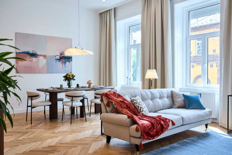 Please scroll down for English! ELADÓ PRÉMIUM MINŐSÉGBEN ÉS ALAPANYAGOKKAL FELÚJÍTOTT LUXUS LAKÁS A BELVÁROS 5. KERÜLETÉBEN. Jól karbantartott, szép homlokzatú, liftes, polgári házban, első emeleti elhelyezkedéssel, 4 szobával, 2 fürdővel, 102 m2-en. TELJES MŰSZAKI ÉS ESZTÉTIKAI felújítás után, energia takarékos fűtésrendszerrel, minőségi háztartási gépekkel felszerelve, tölgyfa parkettával, keményfa design bútorokkal. AZ INGATLAN: - tágas előszoba 10 m2 - nagy és világos amerikai konyhás+étkező a nappalival 37 m2 - hálószoba saját gardróbbal és fürdőszobával 15 m2 - hálószoba saját gardróbbal 15 m2 - dolgozó vagy gyerekszoba 13 m2 - második fürdőszoba - vendég fürdőszoba - mosó-szárító szoba Belmagassága 3.8 méter, remek elosztással, kifejezetten világos, napfényes lakás egy szép házban. A felszereltség és bútorok a vételár részét képezik. Kiváló közlekedés és ellátottság mellett, rövid sétára a Parlament, Margit sziget, Bazilika. Várom hívását a hét minden napján. HISTORICAL CENTER OF BUDAPEST. Classic house in very good condition. Ceiling height - 3.8 m Well-maintained elevator Floor - 1/3 Very bright apartment Southern orientation Quiet street Perfect layout: - spacious entrance hall 10 m2 - luxurious living room 37 m2 (kitchen, dining room, sitting area) - master bedroom 15 m2 with wardrobe and its own bathroom - second bedroom 15 m2 with wardrobe - third bedroom/office/kids room 13 m2 - second bathroom - guest bathroom - laundry A complete renovation with replacement of all utilities. Design project in a modern European style. New energy-efficient heating and air conditioning. High-quality materials, furniture and household appliances. Modern oak parquet. The Parliament, Basilica, Opera, Margaret Island, shopping and business centers, as well as several educational institutions are within walking distance. 3 minutes to the metro. For more info please call +36706493701 , also you can reach me on Whatsapp or Viber