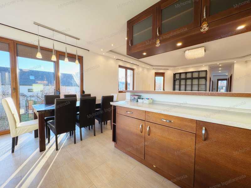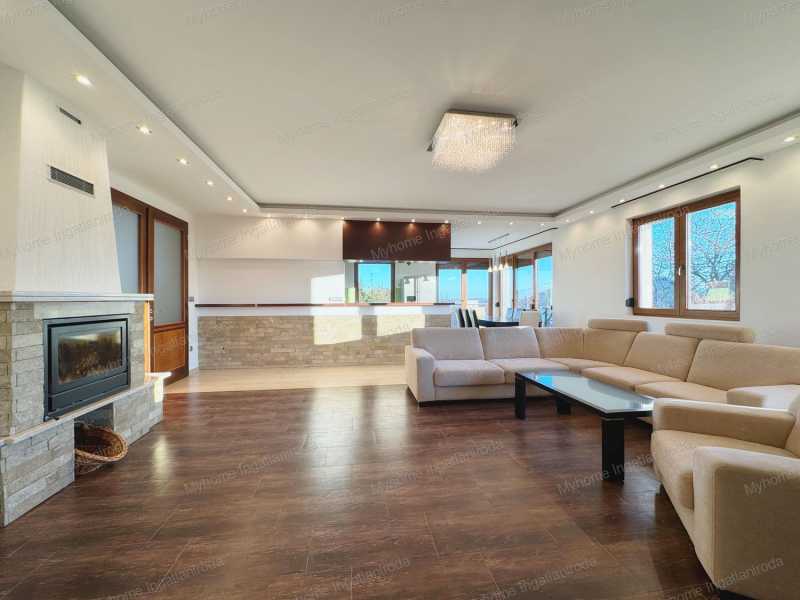 Kiemelkedő minőségű, energiatakarékos családi ház Hévízen! Hévíz csendes, zöldövezeti részén eladó egy 232 m²-es, nappali+ 4 szobás, prémium minőségű, kimagasló műszaki tartalommal rendelkező családi ház, amely minden szempontból megfelel a modern kor követelményeinek. Az ingatlan 822 m²-es, gondozott telken helyezkedik el, panorámás kilátással a Keszthelyi-hegységre. Műszaki jellemzők: Szerkezet és szigetelés: 30 cm-es Leier tégla, 10 cm-es grafitos hőszigeteléssel. Fűtés és hűtés: Daikin Altherma 1-es levegő-víz hőszivattyú gondoskodik a padló- és falfűtésről/hűtésről, helyiségenként külön termosztáttal szabályozható, így télen-nyáron ideális hőmérsékletet biztosít. Energiatakarékosság: A tetőn elhelyezett napkollektor hozzájárul a használati melegvíz előállításához, alacsony rezsiköltséget garantálva. Nyílászárók: Dió színű, 2 rétegű műanyag ablakok redőnyökkel és szúnyoghálóval felszerelve. Energetikai besorolás: AA+, kimagaslóan alacsony fenntartási költség. Kandalló: A nappaliban található, amely kellemes, otthonos hangulatot teremt. Vízlágyító rendszer: Kiemelkedő vízminőség és háztartási gépek védelme. Belső elrendezés: Földszint: Előszoba beépített bútorzattal, tágas amerikai konyhás nappali-étkező (50,83m²), 4 hálószoba, gardróbszoba, 2 fürdőszoba, vendég WC és mosókonyha. Pinceszint: Kétállásos garázs Hörmann garázskapuval (42,5m²), gépészeti helyiség, valamint egy nagy méretű tároló. Teraszok: 2 tágas terasz (17,5m², 14,6m²) egyikük panorámás kilátással, tökéletes helyszín családi reggelikhez vagy esti pihenéshez. Telek és kert: A 822 m²-es telek teljes kertészeti átalakításon megy át, amely biztonságos és tágas teret biztosít gyermekek számára. Lokáció: Hévíz világhírű gyógytava és termálfürdői mindössze pár perc távolságra találhatók. A környék csendes, de közel a város minden kényelmi szolgáltatásához: golfpályák, éttermek, bevásárlóközpontok és wellnessközpontok. Keszthely 8 km, Zalakaros 30 km, Budapest pedig az M76-os autópályán keresztül 2 óra alatt elérhető. Ez a prémium kivitelezésű ingatlan ideális választás nagyobb családok vagy akár befektetők számára is. Az elrendezés, a modern technológiák és az alacsony fenntartási költségek tökéletes harmóniát teremtenek. Érdeklődés esetén hívjon bizalommal, és tekintse meg személyesen ezt a páratlan lehetőséget! Az ingatlanban otthon Myhome