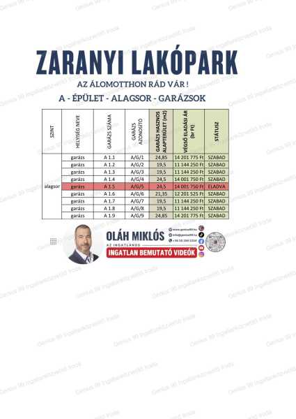 Kaposvár exkluzív lakóparkjában újépítésű társasház alatti garázs eladó ! Most lehetősége nyílik arra, hogy az elsők között vásároljon a város legmodernebb és legbiztonságosabb zárt lakóparkjába, a Zaranyi lakóparkban található garázst, amely Kaposvár központjához közel, mégis nyugodt, zöldövezeti környezetben helyezkedik el. A kínált ingatlan az A épület Alagsor 4. számú garázsa, amely 24,5 m²-es alapterületű, mely önálló helyrajzi számmal rendelkezik. A garázs tervezésénél a maximális komfortot helyezte előtérbe: a Zaranyi Lakóparkban található lakások rendkívül könnyen megközelíthetőek, legmodernebb szekcionált garázskapuk kerülnek beépítésre, elektromos mozgatással, valamint minden garázs saját villanyórával (3x10 Amper) rendelkezik, ezáltal még elektromos autó töltésére is adott a lehetőség. Ha Ön is egy új és modern lakóparkban szeretne garázst vásárolni, akkor a Zaranyi Lakópark ezt is biztosítja az Ön számára. Ne hagyja ki ezt a lehetőséget! További információk, illetve és bővebb felvilágosítás igénye esetén, a lakások kizárólagos értékesítési partnere Oláh Miklós várja megkeresését a +36 30 256 2334 telefonszámon, illetve az info@genius99.hu e-mail címen. Ár.: Bruttó 14.001.750.- Ft Érd: +36302562334 https://genius99.hu/ingatlanok/6707012/ Azonosító: A/G/4 A weboldalon szereplő információk (képek, szövegek ... stb.) teljes mértékben a szerző jogi tulajdonát képezik. A weboldalon szereplő információkat, adatokat másolni, felhasználni csak a szerző előzetes engedélyével lehetséges. A tévedés, árváltoztatás és elírás jogát előzetes tájékoztatás nélkül fenntartjuk!