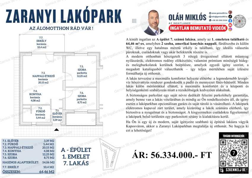 Kaposvár exkluzív lakóparkjában újépítésű lakás eladó ! Most lehetősége nyílik arra, hogy elsőként költözzön be a város legmodernebb és legbiztonságosabb zárt lakóparkjába, a Zaranyi lakóparkba, amely Kaposvár központjához közel, mégis nyugodt, zöldövezeti környezetben helyezkedik el. A kínált ingatlan az A épület 7. számú lakása, amely az 1. emeleten található és 64,46 m²-es, amelyben 2 szoba, amerikai konyhás nappali, fürdőszoba és külön WC, illetve egy hatalmas méretű erkély is található, így ideális választás pároknak, családoknak vagy akár befektetők részére is. A modern otthonban hőszigetelt 3 rétegű üvegezéssel ellátott műanyag nyílászárók, elektromos redőny előkészítés, valamint prémium minőségű hideg- és melegburkolatok kerülnek beépítésre, amelyek egyedi igény szerint, a megadott katalógusból választhatók – így teljes mértékben saját ízlésére formálhatja új otthonát. A lakás tervezése a maximális komfortot helyezte előtérbe: a legmodernebb levegő-víz hőszivattyús rendszer gondoskodik a padló és mennyezet fűtés-hűtésről. Minden lakás külön mérőórákkal ellátott, a maximális komfortért és a központi és helyiségenkénti szabályozás miatt a rezsiköltségek kedvezően alakulnak. A biztonságos parkolást egy saját névre dedikált felszíni parkolóhely garantálja, amely benne van a lakás vételárában és mindig az Ön rendelkezésére áll, de igény esetén a lakóparkban opcionálisan garázs és saját tároló is vásárolható. A lakópark elektromos kapuval zárt terület, amely kizárólag a lakók számára elérhető, így biztosítva a nyugalmat és a biztonságot. A kisgyermekes családokra figyelemmel a lakópark belső területén egy parkosított sétány is kialakításra kerül. Ha Ön is egy új és modern, saját igényeire szabható új építésű lakásra vágyik Kaposváron, akkor a Zaranyi Lakóparkban megtalálja új otthonát. Ne hagyja ki ezt a lehetőséget! További információk, illetve és bővebb felvilágosítás igénye esetén, a lakások kizárólagos értékesítési partnere Oláh Miklós várja megkeresését a +36 30 256 2334 telefonszámon, illetve az info@genius99.hu e-mail címen. Ár.: Bruttó 56.334.000.- Ft Érd: +36302562334 https://genius99.hu/ingatlanok/6707007/ Azonosító: A-7 A weboldalon szereplő információk (képek, szövegek ... stb.) teljes mértékben a szerző jogi tulajdonát képezik. A weboldalon szereplő információkat, adatokat másolni, felhasználni csak a szerző előzetes engedélyével lehetséges. A tévedés, árváltoztatás és elírás jogát előzetes tájékoztatás nélkül fenntartjuk!
