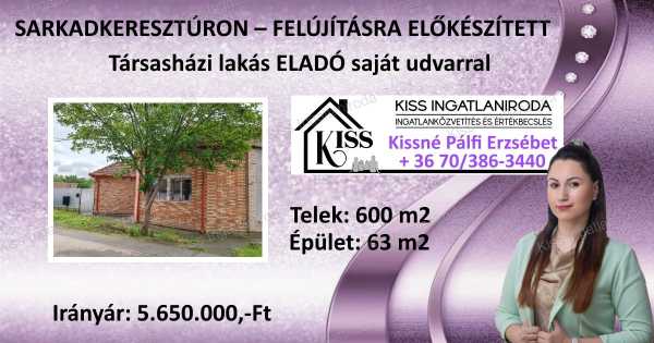 Sarkadkeresztúr egyik csendes, rendezett utcájában eladó egy vályog falazatú, kétlakásos társasház egyik lakása, amely külön bejárattal és saját használatú udvarral rendelkezik. Főbb adatok: • Alapterület: kb. 63 m² • Telek: kb. 600 m² • Falazat: vályog + külső falazat vágott téglával kirakva • Belmagasság: 3 m (álmennyezettel 2,7 m) • Minden helyiségben beton aljzat Felújítás részben elkezdve - belső kialakítás teljesen szabadon tervezhető: • Új, famintás műanyag nyílászárók, kétrétegű üvegezéssel • Álmennyezet acélszerkezete több helyiségben kiépítve • Új villanyóra szekrény, 3 fázis bevezetve • A víz- és gázközmű csatlakozások jelenleg nem aktívak, új rendszer kialakítása az új tulajdonosra vár Egyéb jellemzők: • Teljesen kiürített állapot • Nagyméretű fürdőhelyiség • Alápincézett fürdőszoba, lejáró az előszobából (1,8 m magas) • Térkövezett udvar kisméretű téglával • Félkész bográcsozóhely • A telken egy szerkezetileg rossz állapotú garázs is található • Teljesen körbekerített telek, fémlemez kerítéssel • Az ingatlan jelenleg nem fűthető, új fűtési és melegvíz-rendszer kialakítása szükséges A bejárati és a beltéri ajtók, valamint a burkolatok megvásárlásra kerültek, ezekről kérésre videót is küldök. Amennyiben a megvásárolt minőségi elemekkel együtt vennéd meg az ingatlant, az ára 7.500.000 Ft. Ez az ingatlan ideális lehet azoknak, akik saját ízlésük szerint szeretnének kialakítani egy otthont, vagy akár befektetésként keresnek jól alakítható ingatlant. Irányár: 5.650.000,-Ft Teljes csomaggal: 7.500.000,-Ft Nézd meg az ingatlanról készült videót is: https://youtu.be/-46Tg477VCk További részletekért vagy időpont-egyeztetésért keress bátran üzenetben vagy telefonon! Kissné Pálfi Erzsébet Kiss Ingatlaniroda – VELED az első lépéstől a kulcsátadásig! +36 70/386-3440 Igény szerint az alábbi ügyek elintézésében is segítek neked: - Ingatlanértékesítés - Ingatlanértékbecslés - Hiteligénylés - CSOK + - Falusi CSOK - Babaváró - Biztosítás - Energetikai tanúsítvány - Birtokba adás - Adásvételi szerződés #eladólakás #békésmegye #békéscsaba #ingatlan #lakáskereső #költözés #ingatlanbefektetés #kissingatlaniroda #kulcsátadásig #EladóLakás #békéscsaba #ingatlan #otthon #eladóingatlan #Költözhető #befektetés #ingatlanpiac #kissingatlaniroda #Lakáskereső #Lakásvásárlás #ÚjOtthon #KényelmesLakás #kissing #kissingatlan #kissingatlanok #kissingatlaniroda #ingatlaniroda #ingatlanos #ingatlanközvetítő #ingatlanközvetítés #lakás #ingatlanvideó #home #gyula #sarkad #sarkadkeresztúr #doboz #értékbecslő #értékbecslés #felújítás #otthonfelújítás