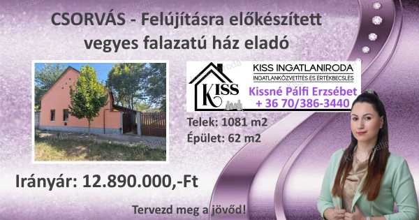 Csorvás központjában eladó egy vegyes falazatú családi ház. A ház belső terei már fel vannak készítve a felújításra, így neked csak a fantáziádat kell hoznod! Az ingatlan egy régebbi vályog- és egy újabb téglaépületből áll, közös tetőszerkezettel, amely megerősítésre került. Külső homlokzata nemesvakolattal borított. ________________________________________ Főbb jellemzők: • Épület: 62 m² • Telek: 1081 m² • Falazata: vegyes (vályog + tégla) • Fűtés: gázkonvektor • Meleg víz: villanybojler • Nyílászárók: gerébtokos, fakeretes ablakok redőnnyel • Bejárati ajtó: hagyományos fa • Az ingatlan belső terei felújításra előkészítve • Két nagyméretű szoba (igény esetén három is kialakítható) • Fürdő és WC külön helyiségben ________________________________________ Ez az ingatlan kiváló választás mindazoknak, akik egy csendes, vidéki életre vágynak, és maguk szeretnék megtervezni lakóterüket. Falusi CSOK és CSOK Plusz nem vehető igénybe! Vidéki Otthonfelújítási Program keretében azonban akár 3.000.000 Ft vissza nem térítendő állami támogatás is igényelhető gyermekes családoknak és nyugdíjasoknak. Részletek az Államkincstár oldalán: Vidéki Otthonfelújítási Program ________________________________________ Nézd meg az ingatlanról készült videót is: https://youtu.be/1g0Fw0K-6bo Irányár: 9.900.000,-Ft Nézzük meg együtt, és legyen ez a TE ÚJ OTTHONOD! ________________________________________ Kissné Pálfi Erzsébet Kiss Ingatlaniroda – VELED az első lépéstől a kulcsátadásig! +36 70/386-3440 ________________________________________ Igény szerint az alábbi ügyek elintézésében is segítek neked: - Ingatlanértékesítés - Ingatlanértékbecslés - Hiteligénylés - CSOK + - Falusi CSOK - Babaváró - Biztosítás - Energetikai tanúsítvány - Birtokba adás - Adásvételi szerződés ________________________________________ #ingatlanhirdetés #ingatlaneladás #ingatlan #ingatlanos #értékbecslés #értékbecslő #békésmegye #csorvás #békéscsaba #eladóház #eladóingatlan #ingatlanvideó #ingatlanértékesítés #ingatlanközvetítő #ingatlanközvetíétés #újotthon #felújítás #vidék