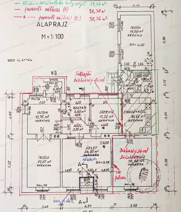 EGY KÜLÖNLEGES ADOTTSÁGÚ INGATLAN KERÜLT MOST AZ INGATLANPIACRA!!! Miskolcon a Csabai kapu frekventált utcájában eladó egy telken 2 ingatlan! Miskolc belvárosához közel, mégis csendes, frekventált helyen eladó egy telken két ház. Jelenleg kivett iroda, üzlet néven van bejegyezve a Földhivatalban. 2 épület áll rendelkezésre: 1., Az utcafrontos 125 m2-es fő épület éveken át üzlethelyiségnek, szervíznek és irodáknak adott otthont. - 1940-ben épült téglaszerkezetű családi ház folyamatosan karban volt tartva és fel lett újítva. - KÜLÖN VEZÉRELHETŐ, modern fűtés rendszer biztosítja ennek a háznak és az udvarban lévő háznak is a meleget. - A helyiségek klimatizáltak. - Modern számítógépes és informatikai hálózat áll rendelkezésne az épületben. - Természetesen az ingatlan visszaalakítható eredeti funkciójára igény szerint. Az ingatlan elosztása: Üzlethelyiség: 24,96 m2 Iroda 1, (Tárgyaló): 17,47 m2 Iroda 2, (Titkárság): 13,75 m2 Iroda 3, (Szerviz I.): 11,36 m2 Iroda 4, (Szerviz II.): 19,98 m2 Iroda 5, (Könyvelés): 19,90 m2 Közlekedő: 3,95 m2 Étkező: 10,66 m2 Mosdó: 3,92 m2 Előtér: 1 : 2,00 m2 Előtér:2 : 3,00 m2 Kézi raktár/pince lejáró/szerver sz.: 4,90 m2 Pince: 14,00 m2 2., A 2003-ban téglából épült földszint és tetőtérbeépítéses 125 m2-es épületben az alsó szinten műhely és szervízrész működött, a felső rész lakórésznek lett átalakítva. Az alsó rész egy nagy műhelyből, vizes blokkból és előtérből, a felső szint 3 szobából, fürdő + WC-ből, konyhából és közlekedőből áll. A lakószintet jelenleg egy megbízható család bérli több éve. 30 napos a felmondási idejük és szívesen maradnának az új tulajdonos albérlőjének is. Helyiségek: Netto alapterület Bruttó alapterület Földszint: Előszoba: 12,24 12,24 Gardrób: 8,78 8,78 Mosdó/WC: 1,25 1,25 1 beállásos garázs/raktár/műhely: 48,15 48,15 Tetőtér: Közlekedő: 3,6 3,6 Konyha: 4,25 6,5 Mosdó/WC: 2,59 4 Nappali: 34,8 34,8 Hálószoba1: 7,68 10,23 Hálószoba2: 7,68 10,23 Összesen: 131,02 139,78 A belső ingatlan mellett egy 68 m2-es fémszerkezetes kocsitároló áll rendelkezésre. Az udvar teljes mértékben le van aszfaltozva, több autó tárolására is alkalmas. Az ingatlan céges tulajdonban van, céggel együtt is megvásárolható. Ha szeretné megtekinteni az ingatlant kérem hívjon és örömmel megmutatom Önnek!