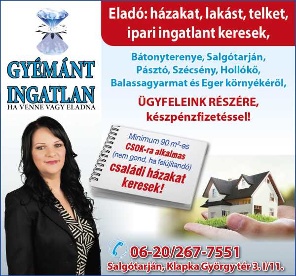 Eladó Salgótarján - Zagyvaróna területén lévő 2- szobás családi ház! Eladásra kínálom a Gyémánt Ingatlaniroda portfóliójából Nógrád vármegyében, Salgótarján - Zagyvaróna településen lévő 60nm-es családi házat. Az ingatlan 1136nm-es telken helyezkedik el, amelyben: 2 szoba, konyha, kamra, fürdőszoba -Wc lett kialakítva. Tartozik még hozzá: gazdasági épületek és egy pince is. Falazata- tégla, tetőszerkezete, fa és stukatúr, födém cserép borítással. Nyílászárók műanyagra lettek cserélve. Közművek: villany, víz -fúrt-kútból, csatorna. Belülről teljesen fel lett újítva az ingatlan, víz, villany vezetékelés, hideg meleg burkolatok cseréje is meg történt. Ha szeretne egy csendes helyen a közel a központhoz, de mégis csendes utcában élni, akkor ez a családi ház megfelelő Ön és családja számára. A Gyémánt Ingatlan iroda teljes körű ügyintézéssel áll az eladók és a vevők rendelkezésére! A kínálatunkból választott ingatlan finanszírozásához kedvezményes hitel lehetőséget kínálunk. Az adásvételi szerződés megkötéséhez igény szerint megbízható ügyvédi közreműködést biztosítunk, és segítséget nyújtunk az adásvételhez kapcsolódó ügyek intézéséhez. Érdeklődés és megtekintés céljából történő időpont egyeztetés érdekében kérem keressen a megadott telefonszámon! Hétfőtől Péntekig 9- 17 óráig.
