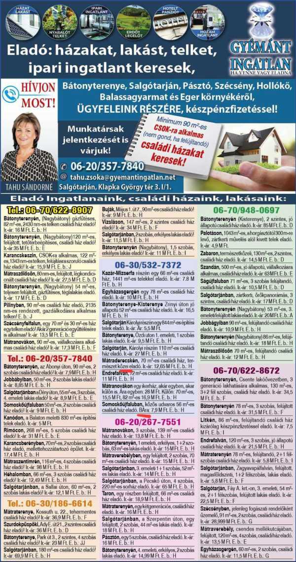 Eladó családi ház Nagylóc! Eladásra kínálok kizárólag a Gyémánt Ingatlaniroda portfóliójából Nógrád vármegyében, Nagylócon 5-szobás 150nm-es újszerű családi házat! A tégla szerkezetű ingatlanban kialakításra került 5-szoba, konyha, kamra, előszoba, fürdőszoba és wc. A meleg víz ellátásról villanybojler, a fűtésről, vegyestüzelésű kazán és 2-klíma gondoskodik. A ház műanyag nyílászárókkal rendelkezik. Tetőszerkezete fa födém, cserép borítással. Az ingatlan egy 1121 m2-es körbe kerített telken helyezkedik el. Tartozik még az ingatlanhoz, 2 - garázs és kinti konyha.. A településen minden megtalálható, ami a hétköznapi élet kényelmét biztosítja:. iskola, óvoda, boltok, orvosi rendelő, posta. A településtől 9 km-re található Hollókő, Magyarország egyetlen faluja, melyet természeti környezetével együtt világörökségi helyszínként tartanak számon. a közelben több horgászati lehetőség is van Nagylóc Szécsénytől 8 km-re, Balassagyarmattól 25 km-re, Salgótarjántól 37 km-re, Budapesttől 93 km-re található. A településen falusi CSOK elérhető, az ingatlan megfelel a követelményeknek , így 3 gyermek esetén akár 7,5 +7,5 millió FT igényelhető vásárlásra és korszerűsítésre. Az ingatlan adottságait és elhelyezkedését tekintve kiváló lehetőséget nyújt minden korosztály számára. Gyémánt Ingatlaniroda teljes körű ügyintézéssel áll az eladó és a vevők rendelkezésére! A kínálatunkból választott ingatlan kedvezményes hitel finanszírozásához CSOK, babaváró illetve vásárlási hitel lehetőséget kínálunk. Az adásvételi szerződés megkötéséhez igény szerint megbízható ügyvédi közreműködést biztosítunk és segítséget nyújtunk az adásvételhez kapcsolódó ügyek intézéséhez. Érdeklődés és megtekintés céljából történő időpont egyeztetés. Hétfőtől Péntekig 9-17 óráig. Eladó ingatlanokat keresünk hazai illetve külföldi ügyfeleink számára!