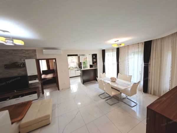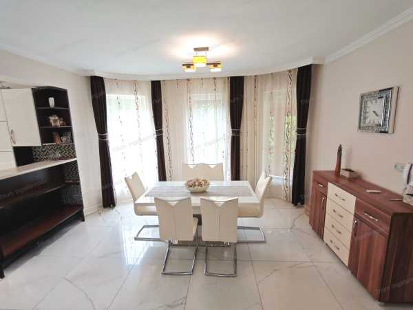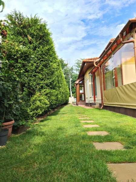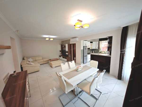 Nyíregyháza egyik legkeresettebb városrészében, a Korányi-kertváros, csendes és rendezett lakóövezetében várja új tulajdonosát ez a 150 m²-es, ikerház, melyhez egy gyönyörűen parkosított, 450 m²-es telek tartozik. A modern, energiatakarékos otthon minden szempontból a kényelmet szolgálja: a 6,25 kW-os napelemrendszer SolarEdge inverterrel és QCells panelekkel szinte teljesen lenullázza a rezsiköltségeket, így az éves fenntartás alig 40.000 forint. A 2015-ben épült, kiváló minőségű tégla ház letisztult és praktikus elrendezésű. A tágas amerikai konyha-nappali a családi élet központja, amelyhez három barátságos, világos hálószoba, egy impozáns, 10 m²-es fürdőszoba dupla mosdóval és bidével, két külön toalettel, valamint egy mosókonyha tartozik. A ház fűtését és hűtését Hajdu kondenzációs gázkazán, négy hűtő-fűtő Gree klíma, radiátorok és padlófűtés kombinációja biztosítja, így minden évszakban kellemes klímát teremt. A belső tér eleganciáját a magasfényű, beépített konyhabútor, a Blanco gránit mosogató és a Bosch beépített gépek emelik ki. Az udvar maga a nyugalom szigete. A 30 m²-es, fedett terasz ideális a baráti beszélgetésekhez vagy a családi összejövetelekhez. A fúrt kútról működő öntözőrendszernek köszönhetően a kert mindig üde és rendezett, a szalonnasütő pedig a hétvégi kikapcsolódást szolgálja. A házhoz garázs és egy 24 m²-es, fedett, térkövezett kocsibeálló is tartozik. A 15 m²-es, saját toalettel ellátott melléképület és a hozzá kapcsolódó 20 m²-es fedett nyári konyha pedig rengeteg plusz lehetőséget kínál. A járható padlás extra tárolóhelyet biztosít, míg a biztonságot elektromos kapu, riasztórendszer, kamerák és mozgásérzékelős világítás védi. Ez az ingatlan nemcsak modern és energiatakarékos, hanem egy valódi oázis Nyíregyháza egyik legnyugodtabb, mégis frekventált részén. Ha olyan otthont keres, ahol a kényelem, a minőség és a takarékosság tökéletes harmóniában találkozik, akkor ezt a házat mindenképp látnia kell! Amennyiben vásárláshoz hitelre is szüksége van, független hitel tanácsadónk ingyenesen tud Önnek segítséget nyújtani bankfüggetlenül a legjobb konstrukciók kiválasztásában és a folyamat lebonyolításában. Ügyfeleink általunk egyedi kedvezményeket is kaphatnak a pénzintézeteknél. Irodánk teljes körű ügyintézést nyújt legyen szó szakszerű tanácsadásról, energetikai tanúsítvány elkészítéséről, hitelügyintézésről vagy profi ügyvédi segítségről.