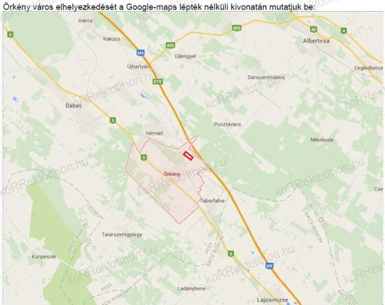 Eladó M5-ös autópálya csomópontjánál az Euroring Versenypálya mellett 18 hektáros építési telek ipari és akár lakóövezeti befektetésre Örkény belterületén! Területe: 177,703 m2 18 hektár Besorolását tekintve GKSZ-2 (előírások) Építési mód: szabadonálló. Beépíthetőség: 50% Maximális épület/párkány magasság: 15 méter Minimális zöldfelület: 20% Infrastruktúra szempontjából: M5-ös autópálya csomópontjánál az Euroring Versenypálya mellett található. Táborfalvi és az örkényi út közelében található. Párhuzamos az autópályával (M5). A meglévő 4 sávos utat rövid időn belül 6 sávosra bővítik. Közművek: közvetlenül a telek előtt helyezkednek el Belterületen, de ipari helyen található, távol a település lakott részétől. A terület Örkény jelenlegi belterületétől É-ra helyezkedik el, az M5-ös autópálya örkényi csomópontjának D-i oldalán. A terület jelenleg még beépítetlen, a terület egésze mezőgazdasági, művelési, síkterület. A terület közel téglalap alakú, a DK-i végén a 4607-es számú mellékút határolja. A terület D-i oldalán mezőgazdasági és erdős területek találhatóak. A terület több irányból is jól megközelíthető, az M5-ös autópályáról a csomóponton keresztül, Örkény belterülete és Örkény felől a 4607-es összekötő úton, valamint Hernád felől a 46111-es bekötőúton. A terület megközelítése az M5-ös autópályáról a terület csomóponti elhelyezkedése miatt közvetlenül megoldott, ezért a terület fejlesztése nem terheli a települést nagyobb forgalommal. Távolságok: BUD reptér 50km - Bp belváros 55km Kecskemét (Mercedes-Benz) 40km Bécs (Ausztria): 300 km Kecskemét (Mercedes-Benz): 40 km Debrecen (BMW): 200 km - Szeged (BYD): 125 km Győr (Audi): 170 km - Esztergom (Suzuki): 120 km Szentgotthárd (Stellantis): 300 km Irányár: 4.466.500,-Eur – 1.8MrdFt