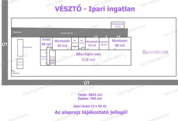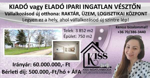 Kiadó vagy eladó ipari ingatlan Vésztőn – Raktár, üzem, logisztikai központ vagy vállalkozásod új otthona! Kiváló lehetőség vállalkozásoknak és befektetőknek! ________________________________________ Kinek ajánljuk? - Gyártó- vagy összeszerelő üzem számára - Raktározási és logisztikai központként - Kereskedelmi vagy ipari vállalkozásoknak - Pályázati projektek megvalósítására – Segítünk a pályázatírásban is! ________________________________________ Főbb paraméterek: - Telek mérete: 3.852 m² (körbekerített, aszfaltozott bejárattal) - Épület összterülete: 750 m² - Irányár: 70.000.000 Ft - Bérleti díj: 500.000 Ft/hó ________________________________________ Az ingatlan jellemzői: - Tégla szerkezetű épület nagy, egybefüggő munkaterületekkel - 3 bejárat – ebből 2 kamionokkal könnyen megközelíthető - 350 m²-es fő munkaterem, plusz három kisebb terem (50 m2, 65 m² és 80 m²) - Irodarész (40 m²) és étkező (25 m²) - Szociális helyiségek: férfi és női mosdók, zuhanyzók - Portaépület és fedett biciklitároló - Fűtés: 2 db nagy teljesítményű vegyestüzelésű kazán - Közművek: víz, szennyvíz, 3x63A ipari áram, gázcsonk a telken ________________________________________ Kiváló elhelyezkedés és megközelíthetőség - Vésztő, Martinovics utca - Aszfaltozott útról könnyen megközelíthető - Sarki telek – kamionos behajtásra alkalmas nagykapuval - Rakodási lehetőség – anyagkiadó ajtók a raktáraknál Miért érdemes Vésztőt választani? Vésztő Békés vármegyében található, jól megközelíthető közúton és vasúton egyaránt. A település Békéscsabától kb. 50 km-re, Gyulától 60 km-re fekszik, így a nagyobb ipari és kereskedelmi központok sincsenek messze. Előnyök: - Jó közúti megközelíthetőség – 47-es főút közelsége, kamionnal is könnyen járható utak - Román határ közelsége – Kiváló lehetőség exportra vagy határon átnyúló együttműködésre - Nyugodt, fejlődő ipari környezet – Kisebb település, alacsonyabb költségekkel - Vasúti kapcsolat – A településen keresztül vasútvonal is halad, ami plusz logisztikai előnyt jelenthet ________________________________________ Üzleti lehetőség és támogatás - Pályázati projektben gondolkodsz? Segítünk a pályázatírásban és a megvalósítás előkészítésében! - Befektetőknek kiváló lehetőség – az ingatlan rugalmasan alakítható különböző tevékenységekre. ________________________________________ Ne hagyd ki ezt a lehetőséget! Nézd meg az ingatlanról készült részletes videót is: https://youtu.be/VHsNdgzgib4 A jelenlegi tulajdonosok megkezdték az ingatlan korszerűsítését, de végül egy másik helyszínen találták meg számításaikat. Most rajtad a sor, hogy itt építsd fel vállalkozásod jövőjét! Nézzük meg együtt és legyen ez a hely, ahol vállalkozásod új szintre lép! Irányár: 70.000.000,-Ft Bérleti díj: 500.000,-Ftt/hó Kissné Pálfi Erzsébet Kiss Ingatlaniroda – Veled az első lépéstől a kulcsátadásig! +36 70/386-3440