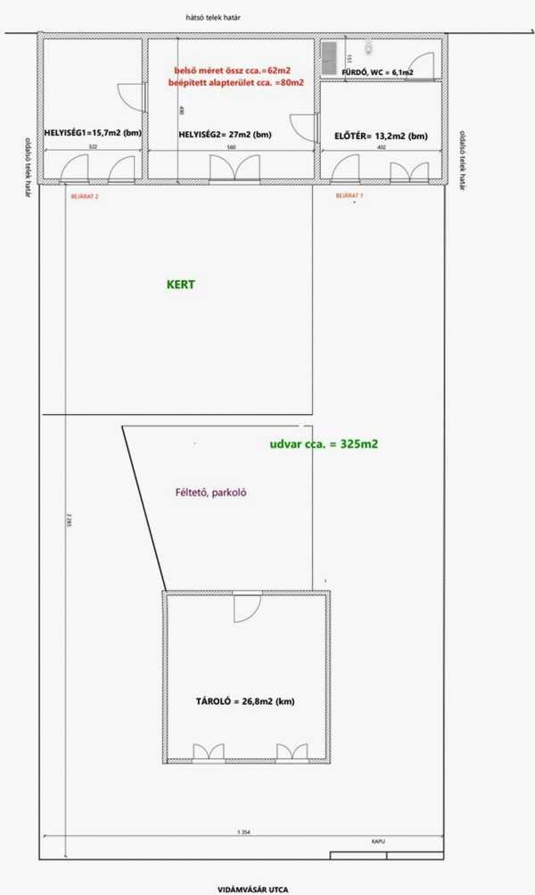 Az ingatlan közvetlenül a tulajdonostól eladó, elérhetősége: Csörgő Ferenc Mihály +36706369730 Budapest, XVI kerület kertvárosi részén önálló társasházi albetétként jegyzett társasházi házrész eladó. A lakóingatlan paraméterei: • beépített lakóépületi alapterület kb. 80 m2, lakóterület kb. 62 m2, önálló kb. 325 m2 telekrésszel. • A telekrészen található tégla építésű tároló épület 26,8 m2, illetve egy féltetővel fedett acél könnyűszerkezetes jármű parkoló 2 jármű részére. • A lakóépület vegyes, tégla-vályog falszerkezetű, fa födémmel és álmennyezettel, állapota részleges felújítást igényel. • Az épület 4 helyiségből áll (3 db, jelenleg irodaként használt nagyobb helyiség, és mosdó), • fűtése gázkonvektorral megoldott, elektromos energia: 3 fázis, ipari áram, kamerával és riasztóval ellátott, optikai internet kiépített. Víz önálló almérővel megoldott, csatorna szomszéddal közösen kialakított. • Az ingatlan a XVI. kerület egyik főútvonalán a Vidám vásár utcában található, közvetlen buszmegálló mellett, megközelíthetősége kiváló tömegközlekedéssel, gépjárművel egyaránt. Az Örs vezér tere 7,5 km, M0 autópálya 2,5 km. • Az ingatlan elhelyezkedéséből adódóan kiválóan hasznosítható ipari, kereskedelmi, vagy irodai célra. Lakóépület céljára is megfelelő, az előkert méretéből adódóan - kb. 23 m hosszú – megoldható a zajvédelem. Egy felújítást követően az ingatlan jelentősen felértékelődik.