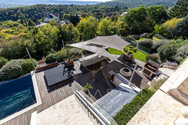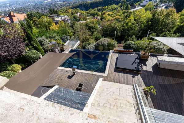 Lélegzetelállító panorámás luxusvilla a Széchenyi-hegyen – az elegancia új szintje Budán A budai dombok között, a XII. kerület egyik legelőkelőbb részén, a Széchenyi-hegy déli lejtőjén található ez a páratlan, négy szintes, közel 1400 nm-es luxusvilla, amely a klasszikus paloták méltóságát ötvözi a modern technológia kényelmével. Az épület és a 1961 nm-es gondosan tervezett kert minden részlete a kompromisszummentes minőség és az időtlen elegancia jegyében született – Budapest egyik legimpozánsabb magánvillája. Főbb paraméterek Lakóterület: ~1400 nm Telekméret: ~1961 nm Szobák: 9 Hálószobák: 7 Fürdőszobák: 5 Wellness-szint: medence, jacuzzi, finn szauna, gőzkabin Fűtés:padló- és falfűtés Légkondicionálás: központi, zónánként vezérelhető Parkolás: 6–8 autó számára, autóforgóval Egyedülálló építészeti megoldások és nemes anyagok A villa minden részlete egy mestermű: a márvány, az ónix és a nemesfa harmóniája tökéletesen kiegészíti a modern technológiai megoldásokat. A reprezentatív, magas belmagasságú terekben a térérzet és a fény játéka uralkodik. A belsőépítészeti koncepciót Magyarország egyik legismertebb designer csapata álmodta meg 2020-ban – az eredmény a klasszikus elegancia kortárs újraértelmezése, amely egyszerre monumentális és otthonos. Luxus minden részletben A ház belső tereiben minden anyag, minden vonal és fényforrás gondosan megkomponált. A tágas nappali, a kristálycsillárokkal díszített étkező, a letisztult, zárt konyha, a stílusos borozó és lounge mind egy életérzést közvetítenek: a nyugalom, a siker és a kifinomultság világát. Ingatlan elrendezése Földszint: Tágas garázs 6–8 autó számára, autóforgóval, tárolóhelyiségek Első emelet: 18 méter hosszú medence visszahúzható üvegfedéssel, 8–10 fős jacuzzi, finn szauna, gőzkabin, kiszolgálóhelyiségek, személyzeti lakrész, modern borospince Második emelet: Nagyméretű nappali, étkező, lounge, zárt konyha, kamra, dolgozószoba, vendég-WC, gardrób, közlekedők Harmadik emelet: Fő hálószoba saját fürdővel és gardróbbal, további 2 hálószoba és 2 fürdőszoba Tetőtér: Nappali, 2 hálószoba és egy fürdőszoba A szinteket impozáns lépcső, valamint lift köti össze. Kert, amely maga a béke szigete A kert 1961 nm-es – automata öntözőrendszerrel, kültéri végtelenített medencével, két elegáns szökőkúttal és teljesen felszerelt kerti grillezővel – ideális helyszín a pihenéshez és a társasági élethez. A panorámás teraszok a pihenés és a reprezentáció tökéletes harmóniáját teremtik meg. Innen Budapest látképe nem csupán kilátás – hanem nap mint nap egy élmény. Technológia, ami a luxust szolgálja A villa teljes egészében padló- és falfűtéssel, valamint központi légkondicionálással működik. Az intelligens otthonrendszer minden funkciót vezérelhetővé tesz, a világítástól a hőmérsékletig – a luxus itt a részletekben rejlik. Kivételes elhelyezkedés A villa Budapest egyik legnyugodtabb és legbiztonságosabb részén található, csupán 10–15 percre a belvárostól. A környék csendes, zöldövezeti és rendkívül reprezentatív – tökéletes választás azoknak, akik egyszerre vágynak exkluzívitásra, nyugalomra és közelségre a városi élethez. Egy villa – egy életstílus Ez a villa méltán a budai luxus esszenciája. Azok számára készült, akik nem elégszenek meg a kiválóval, hanem a tökéleteset keresik. Ha szeretné személyesen is megtapasztalni ennek az egyedülálló ingatlannak a fényűző hangulatát, kérjük, vegye fel velünk a kapcsolatot bizalommal. Örömmel szervezünk privát bemutatót, hogy Ön is átélhesse, mit jelent a budai luxus legmagasabb szintje. Dr Vincellér Zsuzsa