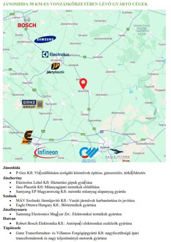 JÁNOSHIDA külterületén ELADÓ egy tudományos, technológiai, innovációs IPARI PARK, KIEMELT FEJLESZTÉSI TERÜLET! Irára: 3Mrd Ft +Áfa Terület: 105 469 m2 (Gip-3) Az ingatlan felhasználási lehetősége széleskörű: ipari termékgyártó üzemek (pl. autóipar), hulladékfeldolgozás, termékgyártás gépek, berendezések gyártása, raktározása építőipari termékek gyártása, tárolása K+F, innovációs nagylabor stb. Az ingatlan Jász-Nagykun-Szolnok vármegyében, Jánoshida település nyugati külterületén, a Jászboldogházára vezető út mentén a település határáról kb. 1 km-re található. Közművek: Vízellátás: saját kút (talpmélysége: 300 m; vízhozam 600 liter/perc Hidroglóbusz: 100 m3 -es víztározó, típus: AK 100-30 Villamosenergia: hálózatfejlesztéssel korlátlanul bővíthető Gázellátás: korlátlanul bővíthető ……………………………………………………….. Engedélyek: Az ingatlanon lévő projekt érvényes kormányhivatali, önkormányzati hozzájárulási engedélyei mellett rendelkezik: lőszermentességi, régészeti, közútkezelői, vízjogi létesítési hozzájárulásokkal és engedélyekkel. Magyarországon – jelen tudomásunk szerint – nincs kiadva ilyen, vagy ehhez hasonló komplex hulladékfeldolgozásra feljogosító engedély. További információ: 0670/930-2653