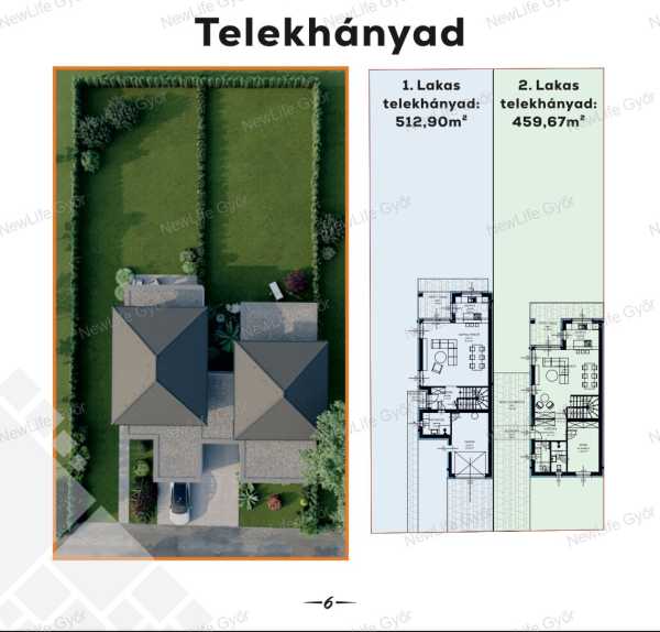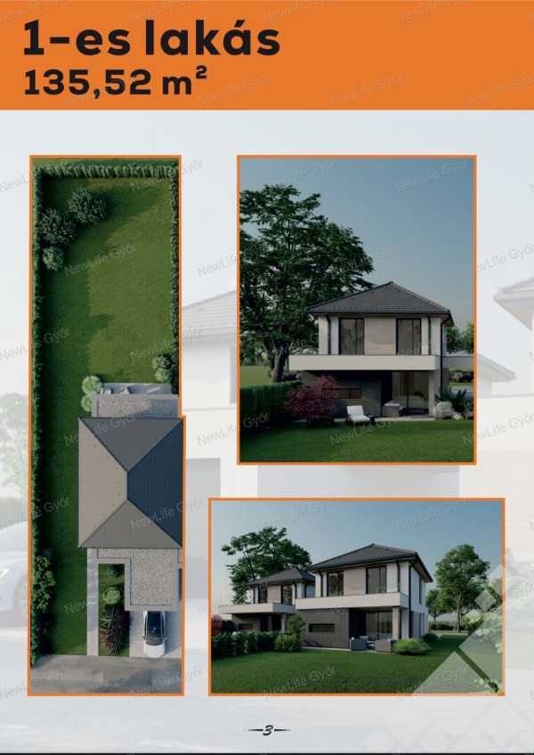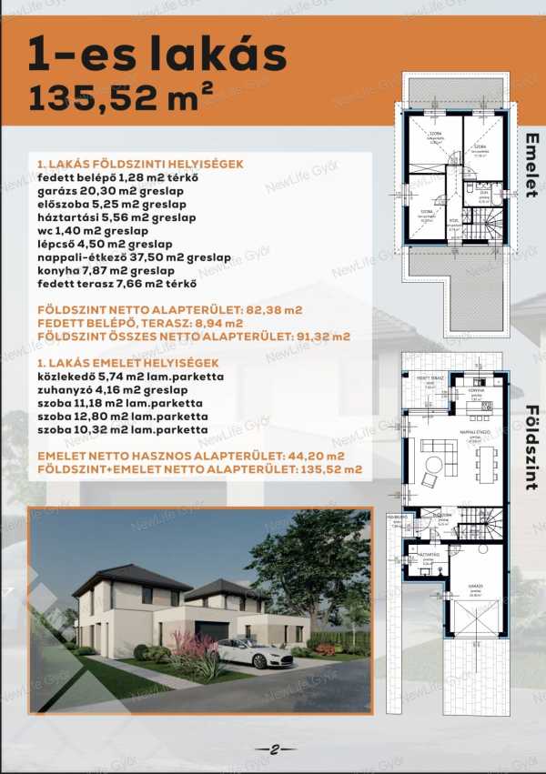 Eladó új építésű ikerház Rábapatona csendes utcájában, amely emeltszintű fűtéskész állapotban kerül eladásra. Az ingatlan 989 nm-es telken helyezkedik el, a két szintes lakások külön kerülnek értékesítésre. A két lakás között került kialakításra egy fedett gépjárműbeálló, ezáltal nincs közös faluk, így teljes mértékben önálló házként funkcionálnak, megteremtve ezzel a tökéletes magánszférát. Az ingatlan a legmagasabb műszaki és minőségi előírásoknak eleget téve kerül kivitelezésre. Gondos tervezésének köszönhetően kiváló elosztású, tágas terek alkotják a lakásokat, amelyek biztosítják a kényelmes életteret. 1.Lakás: Földszinti összes nettó alapterület 91,32 nm, ami a következőkből áll: -fedett belépő 1,28 nm -Fedett terasz 7,66 nm -Garázs 20,30 nm -Előszoba 5,25 nm -Háztartási helyiség 5,56 nm -WC 1,40 nm -Lépcső 4,50 nm -Nappali-étkező 37,50 nm -Konyha 7,87 nm Emelet nettó hasznos alapterülete 44,20 nm, elosztása a következő: -Közlekedő 5,74 nm -Zuhanyzó 4,16 nm -Szoba 11,18 nm -Szoba 12,80 nm -Szoba 10,32 nm A földszint és az emelet nettó alapterülete így 135,52 nm. A lakáshoz tartozó telekhányad 512,90 nm. A fűtésről és a meleg víz ellátásról egyaránt gázkazán gondoskodik, a hőleadás padlófűtéssel történik. Lakás funkciónak megfelelőek lettek tervezve a helyiségek. - Az épületet úgy lett tervezve, hogy az esetlegesen utólag betervezett megújuló energiaforrás berendezéseinek beépítési és csatlakozási lehetőségét az építmény jelentős mértékű megbontása nélkül biztosítani lehessen. Műszaki adatok: A teherhordó külső falak 30 cm vtg. POROTHERM 30 N+F tégla falazóelemből készülnek szükség esetén pillérekkel kiegészítve. Födém, belmagasság: Az épület földszinti belmagassága mind a kettő lakásban 2,65 m, az emeleti belmagasság 2,83 m. A földszinti födém monolit vasbeton födém, az emeleten vasbeton koszorúra faszerkezetes előregyártott rácsostető fedélszerkezet kerül kialakításra. POROTHERM 10 N+F válaszfalelemből készülnek a belső válaszfalak. A vasalt aljzatbeton és a válaszfal közé bitumenes lemez kerül lefektetésre. Hőszigetelés: A talajon fekvő padló lépésálló Austrotherm AT-N100-es hőszigetelést kap 12 cm vastagságban, mely 12 cm magasságban elhelyezésre kerül a szegélyek mentén, az aljzatbeton oldalán. A lábazat 15 cm AUSTROTHERM EXPERT hőszigetelést kap. A padlás 15+15 cm kőzetgyapot hőszigetelést kap a gerendák között, és a gerendákra fektetve. A nem járható lapostető 20 cm AUSTROTHERM AT-N150 hőszigetelő lemezzel készülnek 2-7 cm vastagságú lejtésképző hőszigeteléssel kiegészítve. A főfalak 15 cm vastag AUSTROTHERM AT-H80 homlokzati hőszigeteléssel lesznek ellátva. Nyílászárók: A legkiválóbb hő és hangszigetelő tulajdonságokkal rendelkező nyílászárók kerülnek beépítésre. - A" kategóriás 5 légkamrás műanyag ablak profil UW stabil keverékből - 76mm vastag tok és 82 mm vastag szárnyból álló 3 rétegű üvegezéssel - MACO alapbiztonsági vasalat - hibás működés gátló - résszellőző funkció A műanyag ablak hőátbocsátási tényezői 3 rétegű üvegezés esetén: Ug=0,67W/m2K (3 rétegű üvegezés) Uw=1,1W/m2K (3 rétegű üvegezéssel a teljes szerkezetre) Hőátbocsátási tényezők meleg peremes 3 rétegű CLIMAGUARD üvegezés esetén: Ug=0,5 W/m2K (üvegezés) Uw=0,82 W/m2K (teljes szerkezet) Az ingatlan nem csak a legkorszerűbb elvárásoknak és minőségnek felel meg, hanem elhelyezkedés szempontjából is kiváló, ugyanis amellett, hogy csendes, rendkívül frekventált is. Közelben megtalálható, iskola, óvoda, élelmiszerbolt, minden olyan létesítmény, amelyek közelsége nagyban megkönnyíti a mindennapi életet. Amennyiben szeretne előszerződni egy igazi prémiumkategóriás otthonra, mindezt verhetetlen négyzetméter áron, keressen bizalommal, kár lenne lemaradni! Építési telek beszámítása lehetséges!