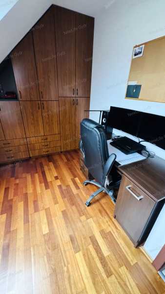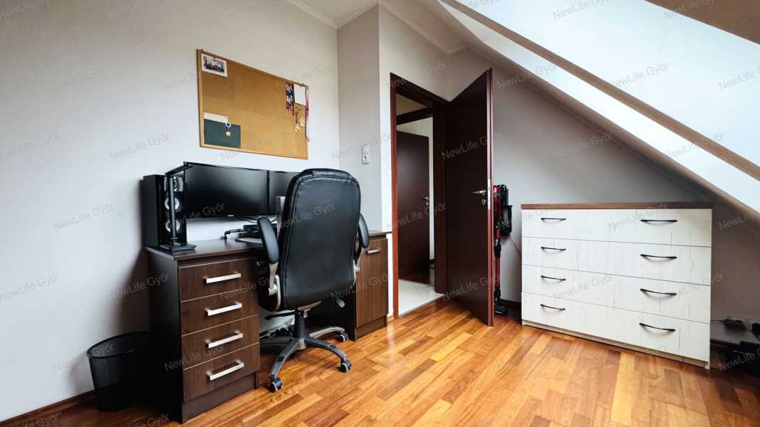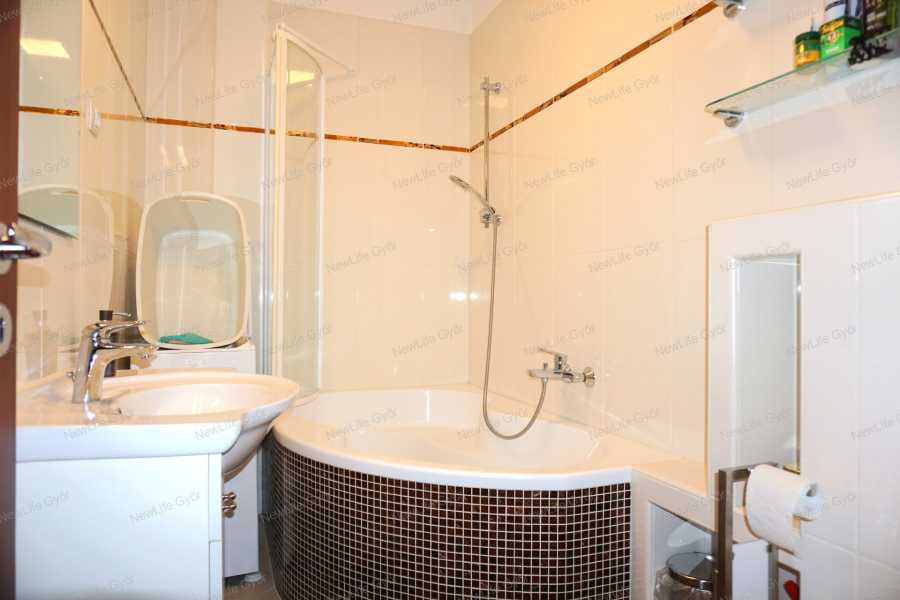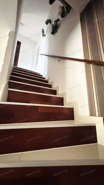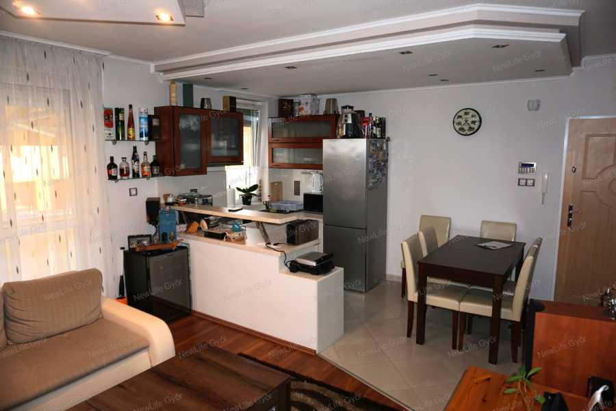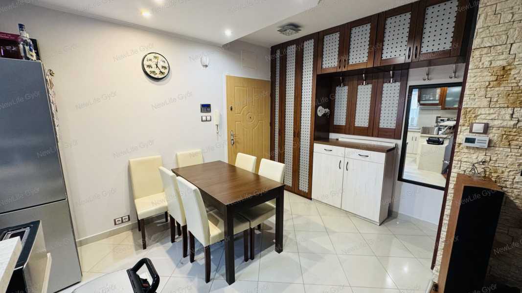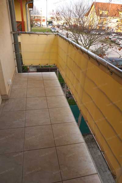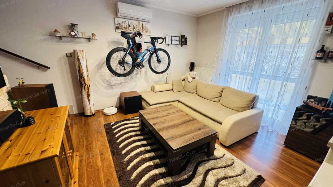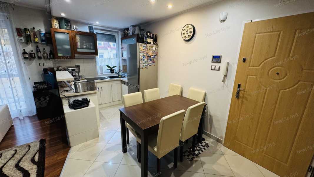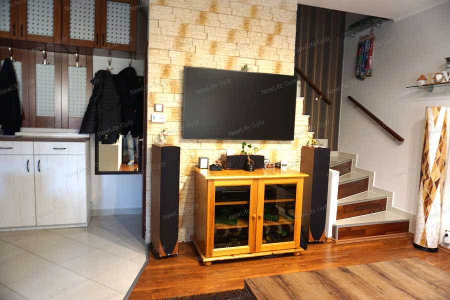 Győr-Ménfőcsanak csendes utcájában eladó egy bruttó 64 nm-es belső kétszintes téglalakás, ami egy 2007-ben épült 6 lakásos társasház 1.emeletén helyezkedik el. Az alsó szint elosztása előtérből, konyha+étkezőből, nappaliból, külön helyiségben elhelyezett WC-ből, valamint egy 4 nm-es burkolt erkélyből áll, ami fölött egy kihúzható árnyékoló segítségével védekezhetünk a forró nyári napokon a közvetlen napsütéstől. Az emeleten kapott helyet egy tágas fürdőszoba WC-vel, félszoba és egy halószoba, amiben egy rendkívül praktikus gardrób helyiség került kialakításra. A lakás nagyon jó elosztású, amelyet világos terek alkotnak, biztosítva ezzel a harmonikus életteret. A jó elosztás mellett a minőség is jelen van az ingatlanban, amiről a szaniterek, magas kopásállóságú burkolatok, gépek és nyílászárók tanúskodnak. A szobák és a nappali laminált padlóval, a többi helyiség kerámia járólappal burkolt. A nyílászárók 3 rétegű műanyagok, amelyek redőnnyel és szúnyoghálóval szereltek. A társasház homlokzata hőszigetelő vakolatot kapott, amely a nyílászárókkal együtt garantálják a tökéletes hőmegtartást és a pénztárcabarát fenntarthatóságot. A fűtésről és a meleg víz ellátásról gázkazán gondoskodik, a hőleadás radiátorokkal történik. Az alsó és felső szinten egyaránt megtalálható egy-egy hűtő-fűtőklíma, amelyek további lehetőséget kínálnak a belső hőmérséklet optimalizálására. A villamoshálózat 3x16 A-ra lett bővítve, így több elektromos berendezés egyidejűleg történő működtetése sem okoz problémát. A társasházhoz tartozik egy közös használatú, kb 120 nm-es udvar. Parkolni a társasház előtt, a lakáshoz tartozó gépjárműbeállóban lehet, ez a vételár részét képezi. Amennyiben szeretné megtekinteni ezt a modern, elegáns lakást, előzetes időpont egyeztetés után megmutatom. Keressen bizalommal!
