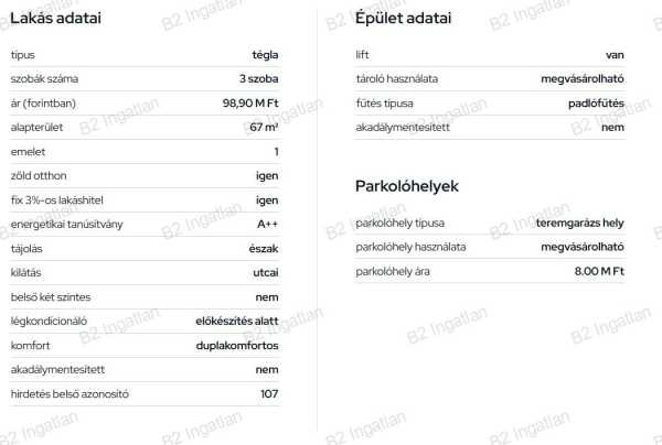 Eladó a VIII. kerület kedvelt részén, a Tisztviselőtelepen, a Vajda Péter utcában egy 65 m²-es, első emeleti, utcai nézetű lakás, amelyhez 3 m²-es erkély tartozik. Az ingatlan nappali + 2 hálószobás elrendezésű, északi fekvésű, jól átgondolt alaprajzzal. A lakás egy új építésű társasházban található, amelynek várható átadása 2026 májusa. Az épület A++ energiaosztályú, lifttel felszerelt, korszerű műszaki megoldásokkal készül. Műszaki jellemzők: – monolit vasbeton szerkezet – háromrétegű hőszigetelt nyílászárók, redőny előkészítéssel – központi VRF rendszerű padlófűtés – hűtés előkészítés fan-coil rendszerhez – minden fogyasztás egyedi mérőórákkal Belső kialakítás: – fürdőszobában kerámia burkolatok, porcelán szaniterek, beépített tartályos fali WC – elektromos törölközőszárítós radiátor – nappaliban és szobákban laminált parketta vagy vinyl burkolat – konyhában mosogatógép csatlakozás (konyhabútor és gépek nélkül) Opcionálisan vásárolható: – tároló: 700 000 Ft / m² – fedett teremgarázs hely: 8 000 000 Ft / db – felszíni parkoló: 7 000 000 Ft / db A lakás praktikus, családbarát elrendezésű, erkélyes kialakítással, modern műszaki tartalommal. További kérdéseivel, illetve személyes megtekintés egyeztetésével kapcsolatban várom megtisztelő hívását. Üdvözlettel: Tari Tímea +36706777703