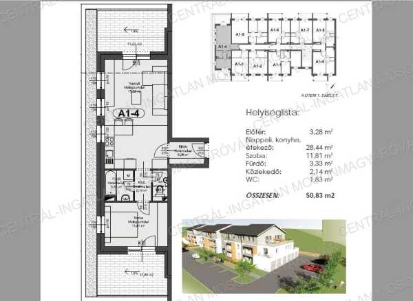 Levélen, az országhatártól néhány kilométerre, új építésű területen társasházi lakások leköthetők. Az osztrák és a szlovák határtól 10 percre, dinamikusan fejlődő településen kiváló lehetőséget kínálunk. A készülő lakópark elegáns külsővel és magas műszaki tartalommal kerül átadásra. A lakások tervezésénél fontosnak tartották az élhetőséget, praktikus megoldásokat. Ezért időtálló, korszerű lakások készülnek. A lakások zöme 1-2 szobás, tökéletesen alkalmas befektetésnek, munka miatt ingázóknak, kezdő lakásnak, és második otthonnak is. Megtalálhatóak a 3 szobás (2 hálószobás) lakások is, földszinten kiskerttel, emeleten erkéllyel. A B1-4 számú első emeleti lakás, 2 szobás és 2 erkélyes. Ebben a kategóriában ez a legjobb fekvésű és elosztású 2 szobás lakás! A 2 db, erkély igazi különlegesség, mindegyik több mint 11m2-es . A lakás fekvése a legjobbak közé tartozik, déli-délkeleti irányba néznek az ablakok, erkélyek keleti és nyugati irányba. Napos, világos, minden évszakban kellemes klímát biztosít. A belső elosztás ideális, a nappali-étkező-konyha 28.44m2-es, wc külön helyiségben van. A lakás hasznos alapterülete 59.3m2 (lakótér 51.69m2 + erkélyek 11.50+11.22m2). Az épület 2 emeletes, minden szinten teljes értékű alapterülettel készülnek a lakások (nincs tetőtér). A földszinti lakásokhoz saját kerthasználat tartozik amit a vételár tartalmaz. Az emeleti lakások majdnem mindegyikéhez tartozik terasz-erkély. A 2. emeleten 26m2-es teraszt is találunk. Lehetőség van garázs vagy kocsibeálló vásárlására is. Saját tárolók is rendelkezésre állnak, ezekből is lehet a lakásokhoz rendelni, igény szerint. A lakások kiváló hőszigeteléssel rendelkeznek, a fűtés és a meleg-víz ellátás házközponti, kondenzációs gázkazánokról történik, minden lakásnál egyedi, digitális mérőórákkal. Ez a jelenlegi legkorszerűbb gázfűtés. A lakások padlófűtéssel ellátottak. Lakásonként a hűtés is előkészítésre kerül klíma előkészítéssel. Már csak a klímát kell feszerelni, de ez később is beszerelhető bontás nélkül. Az épületek 20 cm homlokzati szigetelést kapnak. A földszinti lakások aljzatában 16 cm hőszigeteléssel ellátott felületek lesznek. A lakások között speciális hanggátló fal készül, a aljzatokba lépés-hangszigetelő akusztikai réteg készül a jó hangszigetelés érdekében. Az ablakok, erkélyajtók 3 rétegű üvegezéssel, széles profillal szerelt nyílászárók. Minden ablak és erkélyajtó beépített tokos redőny előkészítést kap, ez tartalmazza a redőnytokot és a lefutó síneket. A feltüntetett ár teljes kulcsrakész állapotot jelöl. Ezen felül a konyhabútor is legyártásra került, ennek árát nem tartalmazza a vételár. Az épület külseje és a teljes környezete teljesen kész, rendezett környezettel, burkolatokkal. A földszinti lakások kertrészét az ár tartalmazza. Az épületek a jelenlegi előírásokat kielégítő hőszigetelésűek, és így az épületgépészet is ennek a fokozott energiatakarékossági igénynek megfelelően van kialakítva. Hitelügyintézésért keressen minket! Minden átadott lakásokhoz 3 év teljes körű garancia jár, bizonyos szerkezetekre 8-15 év garancia. Átadás 2024. I. negyedévben várható, érdemes választani, mert ebben az árban nem sokáig lesz választható lakás. Amennyiben a feni ingatlanok valamelyike felkeltette érdeklődését, vagy ha nem talált megfelelőt hívjon a +36 70/322-2121-es telefonszámon.