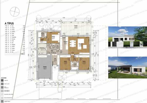 Hőszivattyús fűtés és meleg víz ellátás + igény hűtés rendszer!!! Új fejlesztésű, innovatív családi ház a Centrál-Ingatlan kínálatában. Mosonmagyaróvár fiatal kertvárosi részén új építési családi házat kínálunk. Igény szerint több típusból választható tervek alapján készül a családi ház. - A 116.9m2 területű ház lakóterülete 97.m2 + garázs 19.8m2. A házhoz készülő részben fedett terasz 26.95m2, igény esetén bővíthető. -A kis forgalmú, aszfaltozott utcában épülő családi ház önálló 508m2-es telekre épül. A telek arányai ideálisak, több mint 20 méter széles, a beépítés szabadon álló. Így széles tervezésű házat lehet rá építeni és a szomszéd ház sem az oldalkerítésnél kezdődik. -A ház formája modern, letisztult stílusú tervezés eredménye. A belső elosztás is rendkívül ideális. A földszintes házban megtalálható a nappali-étkező-konyha mellett 3 db hálószoba, továbbá 2 db fürdő, 2 db wc, 2 db gardrób, kamra, háztartási helyiség és egy garázs is. -A nappaliból egy 26.95m2-es, részben fedett teraszra tudunk kilépni. Innen a teljes kert belátható. -Az energetikai besorolás AA!!! A műszaki tartalom magas. Kiváló anyagok felhasználásával, profi kivitelezésben készül minden. A házat egy tapasztalt, sok referenciával rendelkező, stabil vállalkozás készíti. -Külső nyílászárók: Műanyag tokszerkezetű, 3 rétegű üvegezéssel készülnek, gyárilag fóliázott antracit külső felülettel. Igény esetén redőny előkészítéssel. A fűtés hőszivattyúval történik, az összes helyiségben padlófűtéssel. A hőszivattyú biztosítja a meleg víz ellátást is. - A hőszivattyú hűtésre is programozott, igény esetén (plusz költség) nappaliban és szobában készülhet Fan-coil berendezés részére megfelelő kiállás vagy mennyezethűtés is kialakítható. -A ház 30-as porotherm rendszerű téglából készül 15 cm-es homlokzati szigeteléssel. -A feltüntetett ár fűtéskész állapotra vonatkozik. Tartalmazza a telekrész árát, teljes külső befejezést, tereprendezést, belső fűtéskész állapotot. -Az építész alaprajz szerinti méretek „nyers” méretek, vakolatlan falak közötti távolságot jelentik. -Igény esetén napelemrendszer vagy ennek előkészítése is rendelhető amely NULLA ENERGIA felhasználásúvá teszi a házat. -A kulcsrakész befejezésre is van lehetőség. -Kérhető plusz költséggel: redőny, térkövezés, kerítés, hűtésrendszer, stb. Remek választás, AA energetikai besorolás, kiváló lokáció, minőségi kivitelezés. Tervezett átadás lekötéstől függően 6-9 hónap. A megadott elérhetőségeken várom jelentkezését!