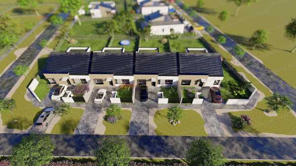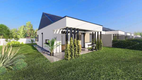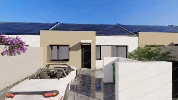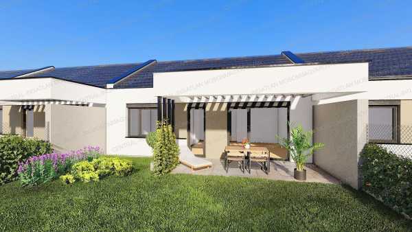 Új építésű, modern, 4 szobás (nappali + 3 hálószoba), zárt sorú (sorházi) beépítésű, családi ház önálló telken! Hőszivattyús fűtés és meleg víz ellátás + hűtés rendszer kialakítás!!! Új fejlesztésű, innovatív sorház jellegű családi ház itt, a Centrál-Ingatlan kínálatában. Fontos megjegyezni az extrákat: térkövezett kocsibeálló. Körbekerítve 3D-s, forrasztott kerítéssel, utcafronton zsaluköves kerítés részekkel. Rejtett redőnytok és lefutó sin beépítéssel. Hőszivattyú a padlófűtés mellett, fan-coil hűtési rendszer kiépítéssel. Hőszivattyú H tarifás villanyórával, stb. Mosonmagyaróvár fiatal kertvárosi részén új sorház jellegű építéssel, családi házakat kínálunk. A zárt sorú beépítés 4 db, önálló házat fog egybe. - A 86.48m2 hasznos alapterületű ház lakóterülete 77.6m2 + terasz 17.7m2. A hasznos alapterület számítása: helyiségek nettó alapterülete és a terasz területének fele. -A kis forgalmú, utcában épülő ház önálló 455m2-es saroktelekre épül. A saroktelek arányai ideálisak, mindössze két szomszéddal, zárt sorú beépítéssel. A saroktelek lehetővé teszi, akár több oldalról is kapu kialakítását. -A ház formája modern, letisztult stílusú tervezés eredménye. A belső elosztás is rendkívül ideális. A földszintes házban megtalálható a nappali-étkező-konyha mellett, három hálószoba, továbbá fürdő wc-vel, egy önálló wc, háztartási helyiség, közlekedő és egy tágas előszoba is. -A nappaliból egy nagy méretű, 17.7m2-es teraszra tudunk kilépni. A terasz térkövezett, teljes lefedése többféle megoldással lehetséges. -A műszaki tartalom magas. Kiváló anyagok felhasználásával, profi kivitelezésben készül minden. A házat tapasztalt, sok referenciával rendelkező, stabil vállalkozás készíti saját beruházásban. -Külső nyílászárók: modern, műanyag tokszerkezetű, 3 rétegű üvegezéssel készülnek. Az ablakok és a teraszajtó beépített redőnytokok és lefutó sínek lesznek beépítve (redőnypalást nélkül), villanykiállással a motoros mozgatáshoz. -A fűtés hőszivattyúval történik, az összes helyiségben padlófűtéssel. A hőszivattyú biztosítja a meleg víz ellátást is. A hőszivattyú H tarifás (kedvezményes) áramot használ. - A hőszivattyú hűtésre is programozott, nappaliban és hálószobákban fan-coil berendezés részére megfelelő kiállás készül, (fan-coil nem része az ajánlatnak). -A ház 15 cm-es homlokzati szigeteléssel készül, továbbá a homlokzati vasbeton szerkezetekre + 5 cm szigetelés kerül. A felület nemesvakolat záróréteget kap. -A feltüntetett ár fűtéskész állapotra vonatkozik. Tartalmazza a telek árát, teljes külső befejezést, tereprendezést, belső fűtéskész állapotot (betonozott aljzat, vakolt falak, betonfödém, víz-, csatorna-, villanykiállások). -A kulcsrakész befejezésre is van lehetőség, választható anyagok felhasználásával, minőségi befejező munkákkal. -Az építész alaprajz szerinti méretek „nyers” méretek, vakolatlan falak közötti távolságot jelentik. -Most lakások teljes közműfejlesztés költségmentes, ami lakásonként több százezer forint megtakarítást jelent. -Minden átadott lakásokhoz 3 év teljes körű garancia jár, bizonyos szerkezetekre 8-15 év garancia. Lekötéstől függően illetékmentes a lakásvásárlás. Ezt érdemes kihasználni. Akár egy konyhabútor árát is meg lehet spórolni. Remek választás, kiváló energetikai besorolás, alacsony rezsi, kiváló lokáció, minőségi kivitelezés. Tervezett átadás lekötéstől függően 2026. IV. negyedév. Amennyiben az új építésű sorházi ingatlan valamelyike , vagy bármely a kínálatunkban található ingatlan felkeltette érdeklődését, hívjon a megadott telefonszámon. Kollégám díjmentes, bank semleges hitel-ügyintézéssel áll rendelkezésére. A nálunk vásárlóknak a lakások befejezéséhez, bútorozásához egyedi kedvezményeket biztosítunk kiemelt partnereinknél!