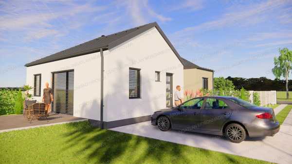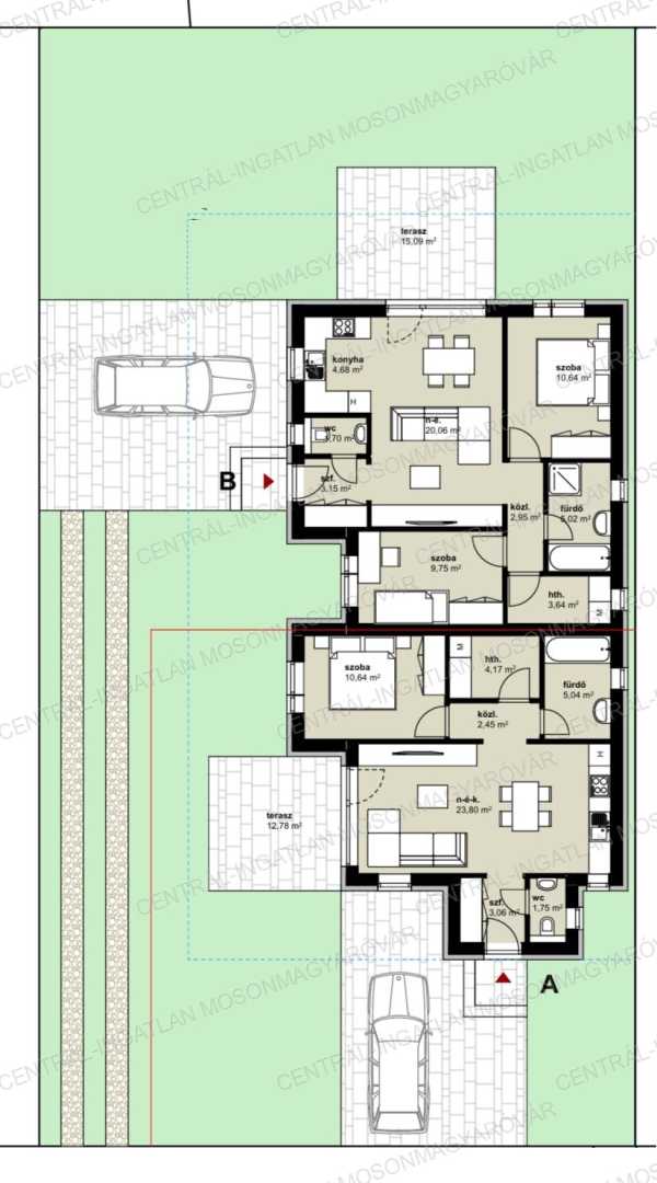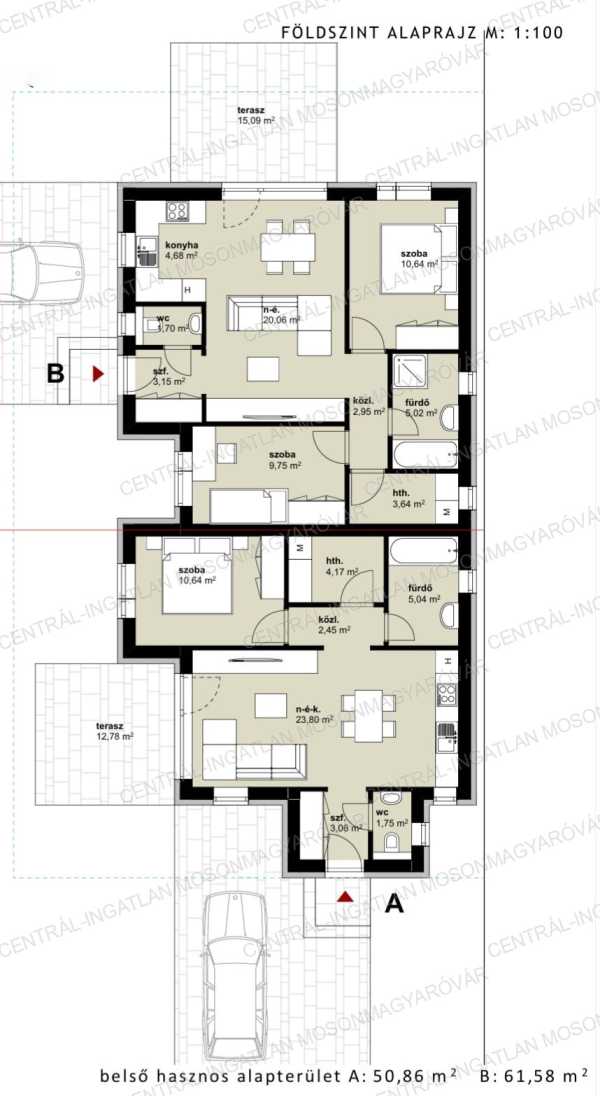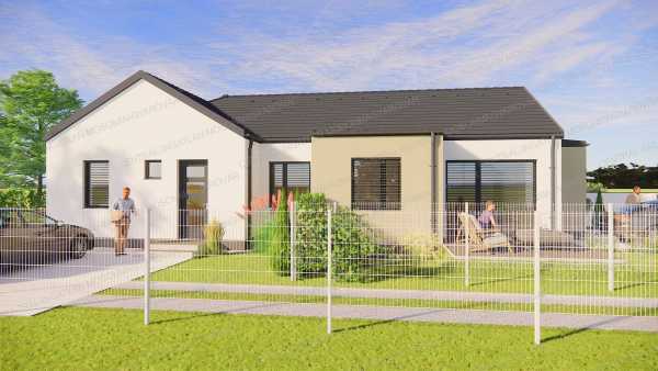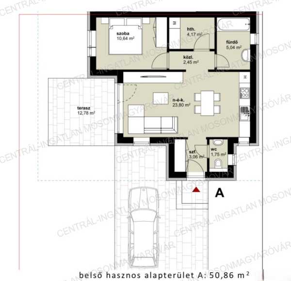 FONTOS! A két szobás, 57m2-es ikerház kerttel, szép környezetben kevesebbért mint egy lakás ára!!! KIZÁRÓLAG A CENTRÁL-INGATLAN KÍNÁLATÁBAN! Mosonmagyaróvár közvetlen közelében, az Aranyossziget-Villaparkban, új építésű, családi házas környezetben, a Mosoni-Duna ölelésében, új építésű ikerházat kínálunk. -A kis forgalmú utcában épülő ikerház egy 480m2-es telekre épül. Önálló bejárattal kerül átadásra mindkét lakórész, nincs közös telekrész. Az alaprajzon látható „A” jelű ikerházi lakáshoz 180m2 telek tartozik. -KÜLÖNLEGESSÉG: Termálvízben fürödhet akár minden nap. Az Aranyossziget Villapark minden ingatlanjára magas ásványi anyag tartalmú, termálvíz van bevezetve. Így a fürdőszobában külön kádtöltő csapon meleg termálvizet lehet használni. Kiváló fürdésre, relaxálásra és gyógyító hatású. -A ház hasznos alapterület 57.25m2, nettó lakóterülete 50.86m2 + 12.78m2 terasz. (a terasz fele beleszámolt a hasznos alapterületbe). -A ház tervezésénél praktikus belső elrendezést vették figyelembe. A belső elosztás ideális, élhető alapterületen minden szükséges megtalálható. A földszintes ház 50.86m2 lakóterületű, helyiségei: nappali-étkező-konyha, 1 hálószoba, továbbá fürdő, önálló wc, előtér, háztartási helyiség ahol a mosógép és a hőszivattyú is elfér és egy közlekedő ahonnan a helyiségek nyílnak. -A nappaliból egy 12.78m2-es teraszra tudunk kilépni és opcionális lehetőségként a terasz bővíthető és a jövőben befedhető. -Magas műszaki tartalommal, kiváló anyagok felhasználásával, profi kivitelezésben készül minden. -Külső nyílászárók: Kömmerling márkájú, több légkamrás profilú, 3 rétegű üvegezéssel készülnek. A külső párkányok festett antracit színű alumíniumból készülnek. -A fűtést és a meleg vizet meleg-víz tárolós, hőszivattyú biztosítja. A ház minden helyiségében padlófűtéssel kerül átadásra. Igény esetén hűtésre optimalizált hőszivattyú vagy klíma előkészítés és beépítés is kérhető, az ár nem tartalmazza. -A ház 30-as porotherm rendszerű téglából készül 15 cm-es homlokzati szigeteléssel. Aljzatban 13 cm hőszigetelés kerül, födémbe 30 cm hőszigetelés kerül beépítésre. Tetőfedés cseréppel történik. -A nappali és a terasz déli-délnyugati fekvése kiváló választás, sok napfény és hőenergia hasznosítható. A lakás minden évszakban világos lesz. -A feltüntetett ár fűtéskész állapotra vonatkozik. Tartalmazza a telekrész árát, teljes külső befejezést, tereprendezést, belső fűtéskész állapotot. -A kulcsrakész befejezésre is van lehetőség. Készültségi szinttől függően változtatás, opcionális átalakítás, extra kérések is megvalósíthatóak. -A közműbeállásokat és közműórák költségét nem tartalmazza a vételár, ez hozzávetőlegesen 700.000.- Ft + Áfa. Ezt a vevő saját nevére tudja igényelni, a kivitelező segítséget nyújt az ügyintézésben. A hőszivattyúhoz H tarifás mérőóra igényelhető. -A telekre két ikerházi lakás kerül, egymástól speciális hanggátló falszerkezettel elválasztva. Nincs áthallás, nincs közösködés. -A lekötéstől/szerződéstől függően vásárlás illetékmentes (Kb. 2 millió Ft lenne az illeték használt ingatlan vásárlása esetén)! Az ikerház a használati megosztással kerül átadásra, igény esetén önálló helyrajzi számra is kiemelhetőek a lakások. -Kérhető plusz költséggel: kerítés, térkövezés, külső munkálatok, kulcsrakész befejezés, beépített bútorok tervezése, belsőépítész tervezés, stb. Remek választás, szuper csendes környék, zöldövezet, Mosoni-Duna vízpart 100m-re, minőségi kivitelezés. Tervezett átadás lekötéstől függően 2026. I. negyedév. A megadott elérhetőségeken várom jelentkezését! Ingyenes, bankfüggetlen hitelügyintézéssel támogatjuk az ingatlanvásárlást!