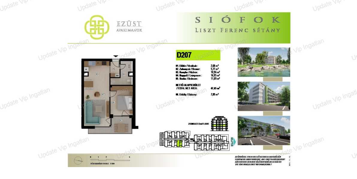 Az Update Vip Ingatlaniroda kínálatából: SIÓFOK EZÜSTPART/SZÉPLAK HATÁRÁN, ÚJÉPÍTÉSŰ, VÍZPARTI, PANORÁMÁS, MEDENCÉS LAKÁS ELADÓ! Önnek ajánlom, ha: -olyan ingatlant keres, aminél már se konyhabútorral, se az elektromos redőny kiépítésével nem akar bajlódni -egy rendezett társasházban, parkosított, medencés területre szeretne rálátni (természetesen a Balaton látványa mellett), és nem a parkolókat szeretné nézni -gépesítve, részben bútorozva, redőnnyel és parkolóval együtt szeretne vásárolni vízparti ingatlant összesen 85Mft-ért. Ez az összeg a jelenlegi piacon, Siófokon, kiemelkedően kedvező ár-érték aránynak minősül! A hirdetésben szereplő lakás paraméterei: Második emeleti lakás -Lakótér: 47.34m2 -Terasz: 7.57m2 (keleti tájolás) -Felszíni gépkocsi beállóhely (~11,25m2) ára: 4.9MFt -Rendelkezik elektromos redőnnyel és szúnyoghálóval is a lakás! -Részben gépesítve és bútorozva eladó, melyeket az ár már tartalmaz. -Újépítés -Közvetlen vízparti elhelyezkedés! -Minőségi tervezés, kivitelezés! -Lakás minősítés (5% Áfa) A lakások közvetlen vízparti elhelyezkedése mellett az igényes tervezés, a minőségi kivitelezés a remek kihasználhatóság és értékállóság is biztosított. Ez az újépítésű projekt (100 lakásos), második otthont kínál a Balaton szerelmeseinek, ahol akár egész évben élvezhetik a korszerű apartmanok kényelmét és a természet közelségét. Az ötemeletes apartmanház a Balatonra merőlegesen helyezkedik el, így biztosítva a lakásokból az örök balatoni panorámát boldog tulajdonosainak. A lakások nappalijából és hálószobáiból a korlátlan panoráma élvezetét ragasztott biztonsági üvegtáblás terasz korlát teszi még zavartalanabbá. A társasház tetején korlátozott számú exkluzív panorámás grill és napozó tetőterasz kerül kialakításra, egyedi vízvétel és áramvétel biztosítása mellett. Rövid műszaki leírás: -A beépítendő anyagok kiválasztásánál a magas minőség elengedhetetlen szempont volt. -Fokozott hangszigeteléssel ellátott lakáselválasztó falak -15 cm vastag külső hőszigetelés -A födémekben 4 cm vastag hő/hangszigetelő táblák -Lift: Az emeletek kényelmes megközelítését 2 db 8 és egy 13 személyes lift szolgálja ki. -Nyílászárók: 3 rétegű üvegezés, külső oldalon antracit színben -Fűtés-Hűtés: LG Multi V-5 hőszivattyús rendszer mely a 2023-as év energia szabványainak megfelelően, kivételesen energiahatékony üzemeltetést tesz lehetővé. -A szobákba, nappalikba felszerelt beltéri egységek léghűtést és légfűtést biztosítanak, melynek köszönhetően rendkívül gyorsan hűtik le vagy fűtik fel a helyiségeket. -A több generációs családok kikapcsolódása érdekében, a beruházás keretein belül gyermekjátszótér és kültéri medencék állnak rendelkezésre tulajdonosok számára. -Az ingatlan előtt húzódó több mint 3 km hosszú szabadstrand, további gondozott zöldterületekkel, parti sétányokkal, sportolási lehetőséget kínáló kölcsönző helyekkel, valamint igényesen kialakított büfékkel szolgálja ki az itt nyaralók igényeit. -A lakópark területére a biztonság érdekében egyedi azonosítás után lehet majd csak belépni. Bővebb információért, megtekintés egyeztetésért, kérem keressen a megadott elérhetőségeimen! UPDATE VIP INGATLAN IRODA további szolgáltatásai: Energetikai tanúsítvány készítés, Díjmentes-bank semleges hitelügyintézés, Ügyvédi háttér, Közjegyző, Földhivatali ügyintézés, Építész, Lakberendező.