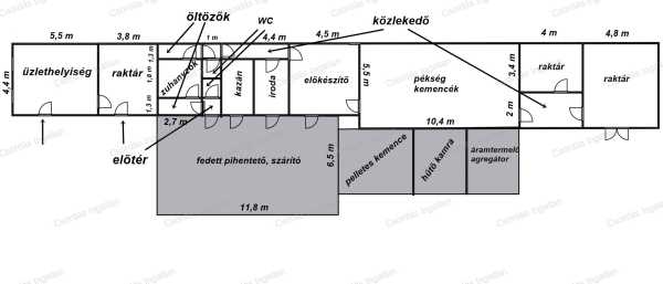 A TÉGLÁBÓL épült épületsor 200 m2 hasznos területtel rendelkezik. Az egykori lakóházból 20 éven át működő péküzemet és egy boltot alakítottak ki. A pékség 2 éve nem üzemel. A működéshez szükséges TELJES FELSZERELÉS, gépek, segédberendezések, kemencék mind-mind rendelkezésre állnak. Az épület utcafronti oldalán a bolt lett kialakítva a hozzátartozó TÁGAS RAKTÁRRAL. Hátrébb az öltözők, zuhanyzók, WC-k kaptak helyet. Továbbhaladva két oldalról is megközelíthető iroda van, kazánház a GÁZKAZÁNNAK, mely RADIÁTOROKON keresztül biztosítja a fűtést. Ez után a sütéshez szükséges előkészítő helyiség lett kialakítva, majd a sütöde. A sütödében egy pihentető, kelesztő kamra, valamint HÁROM KEMENCE található. Egy futószalagos, pelletes kazán fűtésű, egy olajégős kemence, valamint egy forgó zsámolyos elektromos kemence áll rendelkezésre. A sütöde után még két nagy raktárhelyiség segít a tárolásban. Az épületsor előtt közvetlenül a 77 M2-ES FEDETT, ventillátorral ÁTSZELLŐZTETHETŐ TÁROLÓ, PIHENTETŐ KÉSZÁRU RAKTÁR került kialakításra. Mellette a HŰTŐKAMRA van. Áramszünet esetére nagy teljesítményű dízel ÁRAMFEJLESZTŐ biztosítja a működéshez szükséges villanyáramot. Az ingatlanhoz 3 042m2-es, nagy telek tartozik. Az ingatlannal együtt eladó a mellette külön helyrajzi számon szereplő lakóház, udvar, gazdasági épület megnevezésű, a valóságban teljesen üres, 3 260 m2-es telek, így összesen 6 302 m2-nyi hatalmas terület áll rendelkezésre. Egy átalakítással ismét LAKÓHÁZZÁ ALAKÍTHATÓ az ingatlan. Így gazdálkodásra, vállalkozáshoz, állandó lakhelyként egyaránt KITŰNŐ VÁLASZTÁS ez az 50M IRÁNYÁRON kínált ingatlan. HÍVJON, hogy az Öné legyen ez a REMEK lehetőségeket kínáló INGATLAN!