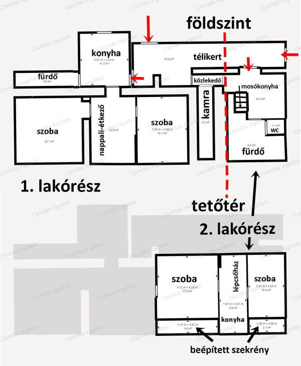 3 lakórészes, FELÚJÍTOTT családi ház eladó Csajágon. Az ingatlan két különálló, vegyes falazatú épületből áll. Az egyik épületben egy földszinti, 3 szobás, 69 m2-es 1. lakórészt találunk, valamint egy földszint + tetőtér kialakítású 60 m2-es, 2 szobás 2. lakórészt. A másik különálló épületben egy 65 m2-es, 2 szobás 3. lakórész található. Az 1. és 2. lakórészbe egy TÁGAS TÉLIKERTEN keresztül juthatunk be. Az 1. lakórészben egy kis előtér után a TÁGAS KONYHA fogad minket. Innen nyílik a bejárattal szemben a zuhanyzós fürdőszoba. Balra a nappali-étkező található. Ebből nyílik jobbra és balra egy-egy valóban KÉNYELMESEN TÁGAS, JÓL BÚTOROZHATÓ, VILÁGOS SZOBA. A fűtést ELEKTROMOS PADLÓFŰTÉS biztosítja vagy választhatjuk tetszés szerint a nappaliban a pár éve egyedileg, igényesen ideépített, GYÖNYÖRŰ CSERÉPKÁLYHÁT is. A szobákban laminált lap, a többi helyiségben járólap a padlóburkolat. A padlófűtést helyiségenként szabályozhatjuk. A 2. lakórész földszintjén találjuk a méretes előteret, melyben jelenleg a mosókonyha is helyet kapott, de konyhaként is remekül használható. Innen nyílik a tényleg nagy, VADONATÚJ FÜRDŐSZOBA, melyből egy külön WC nyílik, valamint egy kis szauna is kialakításra került. A fürdőszobában KÁD ÉS ZUHANYZÓ egyaránt megtalálható. Az előtérből vezet a lépcső a tetőtéri részbe. Itt két szoba és egy konyha lett kialakítva. A földszinten elektromos padlófűtés van, a tetőtérben jelenleg még nincs fűtés. Itt légkondicionálóval vagy elektromos fűtőpanelekkel megoldható a fűtés. A földszinten egy NAGY KAMRA is rendelkezésre áll, melyet tetszés szerint az 1. vagy a 2. lakrészhez is használható. A 3. lakórész, mely egy KÜLÖNÁLLÓ ÉPÜLETBEN van 2 tágas szoba, egy konyha-étkező, egy zuhanyzós fürdő és egy külön WC található. A fűtést ebben a lakórészben 3 db HŰTŐ-FŰTŐ KLÍMA biztosítja. A 3. lakórész elektromos hálózatának KÜLÖN ALMÉRŐJE van. Az épület külső HŐSZIGETELÉST kapott, ablakait hőszigetelt műanyagra cserélték, melyekre REDŐNYT is szereltek. Mindkét épületben az összes villanyvezetéket, vízvezetéket, szennyvízvezetéket újra cserélték. A melegvizet villanybojler biztosítja. A TETŐSZERKEZETET MINDKÉT ÉPÜLETEN FELÚJÍTOTTÁK, a tetőt cseréplemezzel fedték be. Az elektromos hálózatot 5 KW-os NAPELEM RENDSZERREL egészítették ki. A rendelkezésre álló villany teljesítménye 3x25 A. Az ingatlan adottságai kiválóak, hiszen a 3 különálló lakórész kínálja a lehetőséget, hogy akár több generáció is együtt lakhat, de mégis külön vagy kiadható két lakórész is. A vásárláshoz ILLETÉKMENTESSÉG, CSOK PLUSZ támogatott hitel igényelhető. NÉZZE MEG az ingatlanról készült VIRTUÁLIS SÉTÁT is, „sétáljon végig” saroktól sarokig ebben a kitűnő elosztású házban! https://my.matterport.com/show/?m=opQAgYCZ3c6 A virtuális séta bal alsó sarkában kis ikonokkal tetszés szerint választhat a séta, a kétdimenziós alaprajz, a háromdimenziós alaprajz, a bútorozott és a bútor nélküli verzió, valamint a méretezés között. HIBÁTLAN VÁLASZTÁS A JÓ VÉTELHEZ! Ez az ingatlan a Csordásingatlan kínálatában nem csak egy átlagos ház, hanem EGY IGAZI OTTHON, ahol minden apró részlet az Ön kényelmét szolgálja. Ne hagyja ki ezt a lehetőséget! HÍVJON, és nézze meg személyesen is ezt a kivételes adottságú ingatlant – találja meg benne új élete színterét! Bankfüggetlen INGYENES hitelügyintézés, INGYENES CSOK PLUSZ ÜGYINTÉZÉS. Ön csak kitalálja, mire keres megoldást és nyugodtan hátra dőlhet, a többi a mi dolgunk.