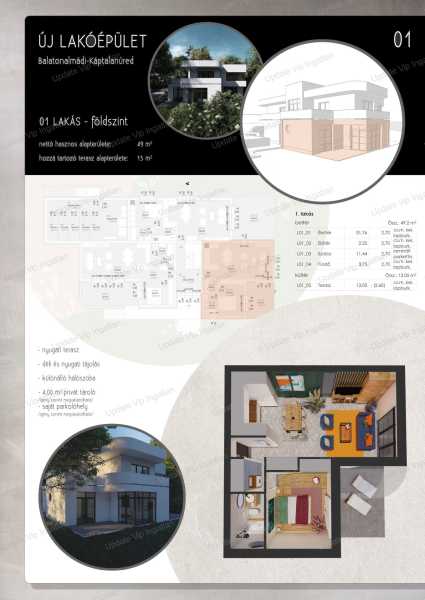 Az UPDATE Vip Ingatlaniroda kínálatából: ÁRCSÖKKENÉS Modern otthon, csendes környezetben, pár percre a Balatontól, Balatonalmádiban! Balatonalmádi közkedvelt városrészében, Káptalanfüreden, a Balatontól 150 m-re kínálunk eladásra egy Bauhaus stílusú, modern, 5 lakásos társasházban épülő új lakást. Társasház: új építésű, 5 lakásos épület Lakás típusa: földszinti, 1 hálószoba + nappali Hasznos alapterület: 49 m² Terasz: 13 m² privát terasz Kert: 125,7 m² kizárólagos használatú kertrész Tájolás: déli és keleti – világos, napfényes otthon Műszaki adatok: Falazat: 30 cm Porotherm okostégla főfalak, pórusbeton válaszfalak Födém: monolit vasbeton Homlokzat: 12 cm EPS hőszigetelés Nyílászárók: 3 rétegű üvegezés, elektromos zsalúzia Fűtés-hűtés: hőszivattyú – mennyezeti hűtés-fűtés és padlófűtés kombináció Kiegészítés: kondenzációs kazán + okosotthon vezérlés Energiahatékony kivitelezés – alacsony fenntartási költség A nagy üvegfelületek és az elektromos árnyékolás maximális komfortot és szabályozható benapozottságot biztosítanak egész évben. Saját parkolóhely és tároló vásárolható, valamint elektromos autó töltési lehetőség is biztosított. Várható átadás: 2026. nyara A lakás ideális választás: -saját otthonnak vagy nyaralónak, -befektetők számára, hiszen a környék kiemelkedő kiadási potenciállal rendelkezik. Bővebb információért, megtekintés egyeztetésért, kérem keressen a megadott elérhetőségeimen! UPDATE VIP INGATLAN IRODA további szolgáltatásai: Energetikai tanúsítvány készítés • Díjmentes, banksemleges hitelügyintézés • Ügyvédi háttér • Közjegyző • Földhivatali ügyintézés • Építész • Lakberendező