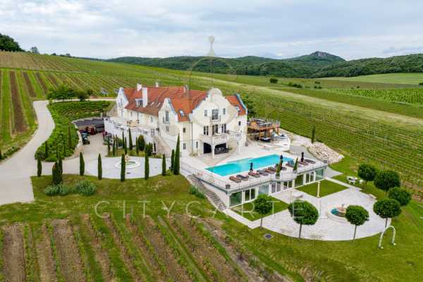 C I T Y C A R T E L INTERNATIONAL LUXURY REAL ESTATE AGENCY bemutatja: FESTŐI környezetben, a Balatonhoz közel kínálok eladásra egy francia Chateaux stílusban megépített, eklektikus, CSODÁLATOS panorámás, 2250 nm alapterületű, FELÚJÍTOTT, 3 szintes, 9 szobás BORBIRTOKOT a hozzá tartozó 10 hektárnyi szőlőtermő területtel! A "Magyarország legszebb szőlőbirtoka" címet elnyert birtok pincéje kb. 300 éves, 2012-ben épült újjá. A magyar Toscana területén a 2000-es évek legelején vásárolt 10 ha szőlőültetvényt újra telepítették, amely az első szőlőtermést 2004-ben adta és a tulajdonos azóta is kiváló minőségű, világhírű, díjnyertes vörösborokat állít elő. A főépület lakóterülete 2250 nm, melyben 9 egyedien, különlegesen berendezett, a Káli-medencére és a teljes birtokra panorámás EXKLUZÍV szoba és 12 fürdőszoba található. A szobákhoz „KONE” típusú lifttel is el lehet jutni. A középső szinten egy elegáns, kulináris élményeket nyújtó nagy teraszos étterem és konyha, valamint tágas, otthonos fogadótér található hatalmas kandallóval. Innen a panorámás teraszra léphetünk ki. Ezen a szinten helyezkedik el egy iroda, 25 fő befogadására alkalmas tárgyalóterem, egy Delux szoba és egy lakosztály. Az emeleten 1 lakosztály és 7 Delux szoba található. A legalsó szinten Wellness részleget alakítottak ki: a hangulatos belső medence és a hozzá tartozó 15 nm-es szauna a 3 nm-es hideg merülő medencével kellemes kikapcsolódást nyújt. Ezen a szinten található külön a borászat és a borpince (a leszüretelt szőlő szinte 200 m-en belül bekerül a pincébe). Az ingatlan különlegessége a hozzá tartozó közel 300 éves, teljesen restaurált borospince, melynek nevéhez több nívós díj tapad. Világhírű borai arany, ezüst, bronz éremmel rendelkeznek. Jegyzetten az ország legértékesebb szőlődűlője (2017.). A kültéri medencéből (6,5 m x 17,5 m) is gyönyörű kilátás nyílik a birtokra. Az épületet több mint 17 távvezérlésű kamera felügyeli. Szélessávú internet rendelkezésre áll a közösségi térben. Fűtése: faelgázosítós, számítógép által vezérelt pellet kazán + napkollektor. Az épület magas színvonalon kivitelezett, több funkció ellátására alkalmas, további emeletekkel és tagépületekkel bővíthető. Az ár magában foglalja a teljes berendezést és bútorzatot, a birtok karbantartásához szükséges eszközöket és gépeket, valamint a márkanév használatának jogát, illetve a készleten lévő borokat is. A birtok körül nagy vadászterület van. Kifejezetten alkalmas turisztikai célokra, de akár modern családi birtoknak is ideális! Megközelítése lehetséges gépkocsival, de saját helikopterleszállóval is rendelkezik. A közkedvelt, exkluzív szálláslehetőséget biztosító ingatlan bor és kulináris élvezeteket nyújtó családi, baráti, céges rendezvényeknek, bortúráknak, borkostolóknak, esküvőknek a helyszíne. Ára: 4 900 000EUR Tervek: 5 csillagos S Gourmet Hotel kialakítására, melynek fejlesztési költsége: Kb. 18,5 M EURO. Befektetési megtérülés kb. 13-15 év ( 20 éves futamidejű hitelfelvétel és pályázati lehetőségek vannak). A bővítés során figyelembe vehető teleknagyság 6500 nm (a bővítésre teljes tervdokumentáció áll rendelkezésre). A jelenlegi tulajdonos akár levezetné a fejlesztést. Amennyiben a hirdetés felkeltette érdeklődését, hívását szeretettel várom! Dr. Vincellér Zsuzsa +36 30 815 2510 v.zsuzsa@citycartel.hu