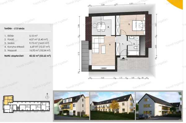 Csorna központi részén épülő 17 lakásos társasházban új építésű lakások eladók. A meghirdetett tetőtérben található bruttó 53,62 nm-es, nettó 42,52 nm-es ingatlanban konyha, nappali, szoba, fürdőszoba, előtér kerül kialakításra. A lakás fűtéskész ára: 39.900.000 Ft. Kulcsrakész befejezés kérhető. A lakáshoz 1 db gépkocsibeálló tartozik. A minőségi anyagokból épülő tárasház 30 cm-es falazóelemből, 15 cm-es homlokzati hőszigeteléssel épül. A 3 rétegű műanyag nyílászárók kívül fehér színűek. A társasház fűtését hőszivattyú biztosítja, lakásonként egyedi hőmennyiségmérővel, hőleadás padlófűtéssel. A társasház udvarán térkövezett gépkocsibeállók kerülnek kialakításra. Várható fűtéskész átadás: 2026 ősz Bővebb információkért forduljon hozzám bizalommal. Hétköznap és hétvégén is várom hívását! Díjmentes, bankfüggetlen hitelügyintézéssel állunk rendelkezésére. A hirdetésben feltüntetett képek illusztrációk.