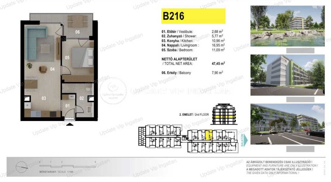 AZ UPDATE VIP INGATLANIRODA KINÁLATÁBÓL: SIÓFOK SZÉPLAK/EZÜSTPART HATÁRÁN, ÚJ ÉPÍTÉSŰ, VÍZPARTI, PANORÁMÁS, MEDENCÉS LAKÁS ELADÓ! AZONNAL BIRTOKBA VEHETŐ! A hirdetésben szereplő lakás paraméterei: Második emeleti lakás -Lakótér: 47m2 -Erkély/Terasz: 7m2 -Újépítés -Közvetlen vízparti elhelyezkedés! -Minőségi tervezés, kivitelezés! -Lakás minősítés (5% Áfa) Külön megvásárolható: Felszíni gépkocsi beállóhely (11,25m2): 4.9MFt Saját tároló (3.48m2): 4.9MFt A lakások közvetlen vízparti elhelyezkedése mellett az igényes tervezés, a minőségi kivitelezés a remek kihasználhatóság és értékállóság is biztosított. Az ötemeletes apartmanház a Balatonra merőlegesen helyezkedik el, így biztosítva a lakásokból az örök balatoni panorámát boldog tulajdonosainak. A lakások nappalijából és hálószobáiból a korlátlan panoráma élvezetét ragasztott biztonsági üvegtáblás terasz korlát teszi még zavartalanabbá. A társasház tetején korlátozott számú exkluzív panorámás grill és napozó tetőterasz kerül kialakításra, egyedi vízvétel és áramvétel biztosítása mellet. Rövid műszaki leírás: -A beépítendő anyagok kiválasztásánál a magas minőség elengedhetetlen szempont volt. -Fokozott hangszigeteléssel ellátott lakáselválasztó falak -15 cm vastag külső hőszigetelés -A födémekben 4 cm vastag hő/hangszigetelő táblák Lift: 2 db 8 és 1db 13 személyes lift Nyílászárók: 3 rétegű üvegezés, külső oldalon antracit színben -Fűtés-Hűtés: LG Multi V-5 hőszivattyús rendszer mely a 2024-es év energia szabványainak megfelelően, kivételesen energiahatékony üzemeltetést tesz lehetővé. -A szobákba, nappalikba felszerelt beltéri egységek léghűtést és légfűtést biztosítanak, melynek köszönhetően rendkívül gyorsan hűtik le vagy fűtik fel a helyiségeket. -A több generációs családok kikapcsolódása érdekében, a beruházás keretein belül gyermekjátszótér és kültéri medencék állnak rendelkezésre tulajdonosok számára. -Az ingatlan előtt húzódó több mint 3 km hosszú szabadstrand, további gondozott zöldterületekkel, parti sétányokkal, sportolási lehetőséget kínáló kölcsönző helyekkel, valamint igényesen kialakított büfékkel szolgálja ki az itt nyaralók igényeit. -A lakópark területére a biztonság érdekében egyedi azonosítás után lehet majd csak belépni. Bővebb információért, megtekintés egyeztetésért, kérem keressen a megadott elérhetőségeimen! UPDATE VIP INGATLAN IRODA további szolgáltatásai: Energetikai tanúsítvány készítés, Díjmentes-bank semleges hitelügyintézés, Ügyvédi háttér, Közjegyző, Földhivatali ügyintézés, Építész, Lakberendező.
