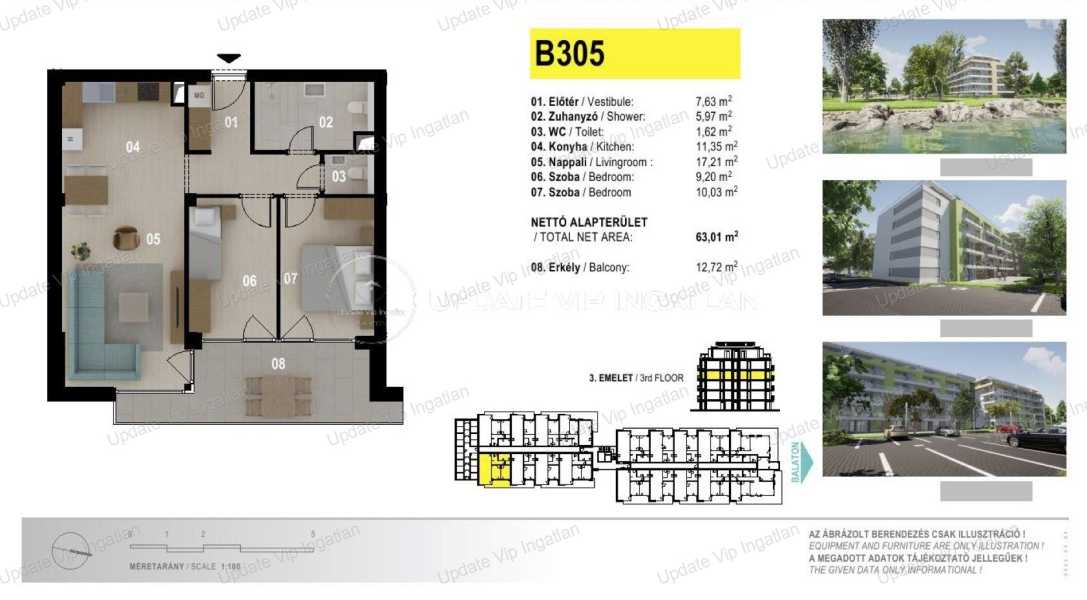 AZ UPDATE VIP INGATLANIRODA KINÁLATÁBÓL: SIÓFOK EZÜSTPART/SZÉPLAK HATÁRÁN, ÚJ ÉPÍTÉSŰ, VÍZPARTI, PANORÁMÁS, MEDENCÉS LAKÁS ELADÓ! AZONNAL BIRTOKBA VEHETŐ! A hirdetésben szereplő lakás paraméterei: Harmadik emeleti lakás -Lakótér: 62m2 -Erkély/Terasz: 11m2 -Újépítés -Közvetlen vízparti elhelyezkedés! -Minőségi tervezés, kivitelezés! -Lakás minősítés (5% Áfa) Külön megvásárolható: Felszíni gépkocsi beállóhely (11,25m2): 4.9MFt Saját tároló (3.48m2): 4.9MFt A lakások közvetlen vízparti elhelyezkedése mellett az igényes tervezés, a minőségi kivitelezés a remek kihasználhatóság és értékállóság is biztosított. Az ötemeletes apartmanház a Balatonra merőlegesen helyezkedik el, így biztosítva a lakásokból az örök balatoni panorámát boldog tulajdonosainak. A lakások nappalijából és hálószobáiból a korlátlan panoráma élvezetét ragasztott biztonsági üvegtáblás terasz korlát teszi még zavartalanabbá. A társasház tetején korlátozott számú exkluzív panorámás grill és napozó tetőterasz kerül kialakításra, egyedi vízvétel és áramvétel biztosítása mellet. Rövid műszaki leírás: -A beépítendő anyagok kiválasztásánál a magas minőség elengedhetetlen szempont volt. -Fokozott hangszigeteléssel ellátott lakáselválasztó falak -15 cm vastag külső hőszigetelés -A födémekben 4 cm vastag hő/hangszigetelő táblák Lift: 2 db 8 és 1db 13 személyes lift Nyílászárók: 3 rétegű üvegezés, külső oldalon antracit színben -Fűtés-Hűtés: LG Multi V-5 hőszivattyús rendszer -A szobákba, nappalikba felszerelt beltéri egységek léghűtést és légfűtést biztosítanak, melynek köszönhetően rendkívül gyorsan hűtik le vagy fűtik fel a helyiségeket. -A több generációs családok kikapcsolódása érdekében, a beruházás keretein belül gyermekjátszótér és kültéri medencék állnak rendelkezésre tulajdonosok számára. -Az ingatlan előtt húzódó több mint 3 km hosszú szabadstrand, további gondozott zöldterületekkel, parti sétányokkal, sportolási lehetőséget kínáló kölcsönző helyekkel, valamint igényesen kialakított büfékkel szolgálja ki az itt nyaralók igényeit. -A lakópark területére a biztonság érdekében egyedi azonosítás után lehet majd csak belépni. Bővebb információért, megtekintés egyeztetésért, kérem keressen a megadott elérhetőségeimen! UPDATE VIP INGATLAN IRODA további szolgáltatásai: Energetikai tanúsítvány készítés, Díjmentes-bank semleges hitelügyintézés, Ügyvédi háttér, Közjegyző, Földhivatali ügyintézés, Építész, Lakberendező.