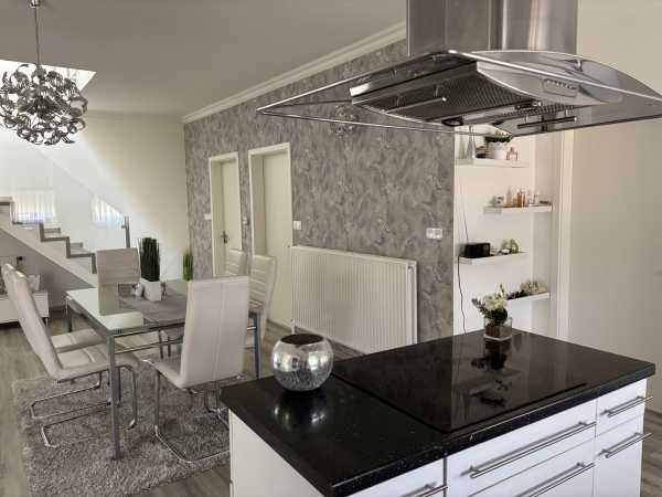 Kétgenerációs, külön vendéglakásos családi ház eladó Nagykátán! 256 m² minőség, tágas terek, 1019 nm gondozott kert! Ha nem éred be az átlagossal és igényes otthont keresel Nagykátán, ahol két generáció is kényelmesen élhet, vagy akár a vállalkozásodat is hazavihetnéd ez az ingatlan telitalálat! Nagykáta csendes, de jól megközelíthető részén 2000-ben épült ez a kiváló állapotú, 256 m²-es családi ház, mely külön bejáratú vendéglakással, tágas garázzsal, és gondozott kerttel várja új tulajdonosát! Főépület jól átgondolt elosztás, kényelmes terek Földszint 96 m² • Tágas amerikai konyhás nappali • Modern konyhabútor + étkező • Kamra • Háztartási helyiség • Sarokkádas fürdőszoba, külön wc • Közvetlen teraszkapcsolat: nappaliból nyíló 18 m²-es fedett terasz Emelet 70 m² • 3 tágas, világos hálószoba • Zuhanyzós fürdőszoba WC-vel Vendéglakás 33 m² • Másfél szoba + zuhanyzós fürdőszoba • Saját bejárat a kert felől Ideális idős családtagnak, kamasz gyermeknek, irodának stb… Garázs 35 m² Akár két autó számára is kényelmes helyet biztosít. Tárolásra, barkácsműhelynek is tökéletes. Telek 1019 nm • Rendezett, füvesített kert, dísznövényekkel, örökzöldekkel • Kerti pihenéshez, sütögetéshez tökéletes tér Műszaki tartalom • Masszív B30 porotherm tégla falazat • Zsindely tető • Hőszigetelt fa nyílászárók, redőnyökkel • Teljes közmű • Folyamatos karbantartás • Elektromos nagykapu, gondozásmentes kerítés Fűtés: új kondenzációs gázkazán, radiátorokkal szerelve 3 hűtő-fűtő klíma Ez a ház nem csak egy jó lehetőség hanem egy valóban szép, minőségi otthon, amit ritkán kínálnak eladásra ilyen állapotban és ilyen adottságokkal. Ne hagyd ki! Hívj most, és nézd meg személyesen, hogy milyen az amikor egy ingatlan tényleg “készen áll az életre”!