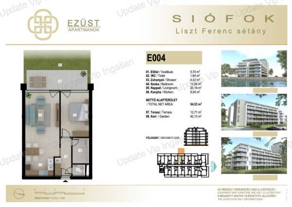 AZ UPDATE VIP INGATLANIRODA KINÁLATÁBÓL: SIÓFOK SZÉPLAKON, ÚJÉPÍTÉSŰ, VÍZPARTI, BALATONI PANORÁMÁS, MEDENCÉS LAKÁS ELADÓ! AZONNAL BIRTOKBAVEHETŐ! A hirdetésben szereplő lakás paraméterei: Földszinti lakás -Lakótér: 53m2 -Terasz: 19m2 -Kert: 33m2 -Újépítés -Közvetlen vízparti elhelyezkedés! -Minőségi tervezés, kivitelezés! -Lakás minősítés (5% Áfa) Külön megvásárolható: Felszíni gépkocsi beállóhely (~11,25m2): 4.9MFt Siófok ezen hangulatos, érintetlen panorámás részén, a gondos és alapos tervezői munka eredményeként kerül megvalósításra a közvetlen vízparti 71 lakásos, 5 emeletes, újépítésű társasház. (Az emeletek kényelmes megközelítését 13 személyes lift szolgálja ki.) A tervezés során fontos szempont volt a praktikum, a használhatóság, a fenntarthatóság, melyet a korábban értékesített 750 siófoki lakás és nyaraló tervezésének és értékesítésének tapasztalata szült, megannyi vásárlói visszajelzés alapján. A társasház második otthont kínál a Balaton szerelmeseinek, ahol akár egész évben élvezhetik a korszerű apartmanok kényelmét és a természet közelségét, amely ugyanakkor egy kivételesen értékálló befektetés is! A társasház tetején korlátozott számú exkluzív panorámás grill és napozó tetőterasz kerül kialakításra (ahol egyedi vízvétel és áramvétel kerül kialakításra). -Fűtés-Hűtés: LG Multi V-5 hőszivattyús rendszer -A szobákba, nappalikba felszerelt beltéri egységek léghűtést és légfűtést biztosítanak, melynek köszönhetően rendkívül gyorsan hűtik le vagy fűtik fel a helyiségeket. -Szigetelés: 15 cm vastag külső hőszigetelés -Nyílászárók: 3 rétegű üvegezéssel készülnek, külső oldalon antracit színben. -A lakáselválasztó falak fokozott hangszigetelésűek, plusz a födémekben 4 cm vastag hő/hangszigetelő táblák akadályozzák meg a függőleges irányú hangterjedést. -A lakások nappalijából és hálószobáiból a korlátlan panoráma élvezete rozsdamentes, szálcsiszolt oszlopokkal, kapaszkodókkal, ragasztott biztonsági üveg korláttal biztosított. -A több generációs családok kikapcsolódása érdekében, a beruházás keretein belül gyermekjátszótér és kültéri medencék állnak rendelkezésre tulajdonosok számára. -Az ingatlan előtt húzódó több mint 3 km hosszú szabadstrand, további gondozott zöldterületekkel, parti sétányokkal, sportolási lehetőséget kínáló kölcsönző helyekkel, valamint igényesen kialakított büfékkel szolgálja ki az itt nyaralók igényeit. -A lakópark területére a biztonság érdekében egyedi azonosítás után lehet majd csak belépni. Bővebb információért, megtekintés egyeztetésért, kérem keressen a megadott elérhetőségeimen! UPDATE VIP INGATLAN IRODA további szolgáltatásai: Energetikai tanúsítvány készítés, Díjmentes-bank semleges hitelügyintézés, Ügyvédi háttér, Közjegyző, Földhivatali ügyintézés, Építész, Lakberendező.